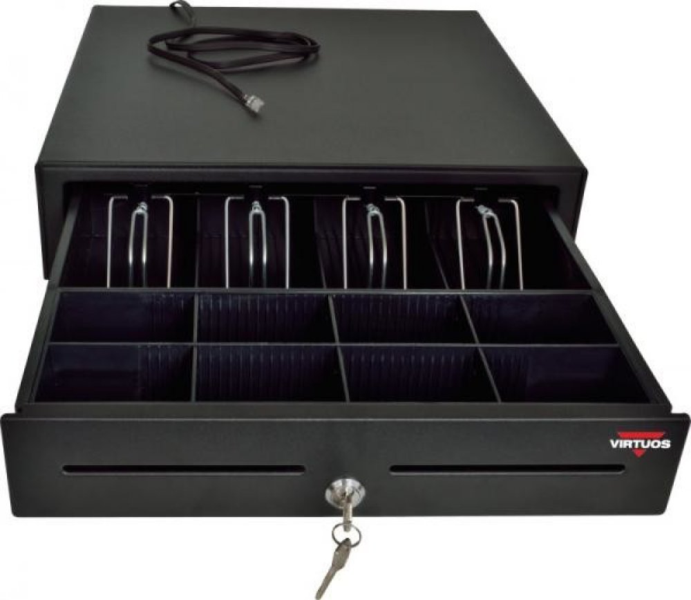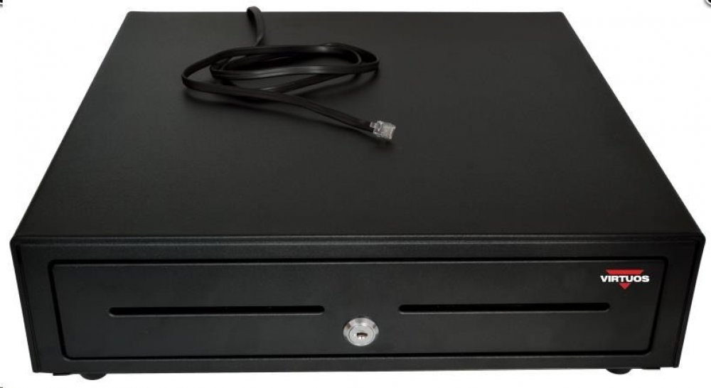 Pokladní zásuvka za příznivou cenu dodávaná včetně kabelu s RJ12-6P6C konektorem pro použití s běžnými tiskárnami a adaptéry RS-232 i USB Virtuos.