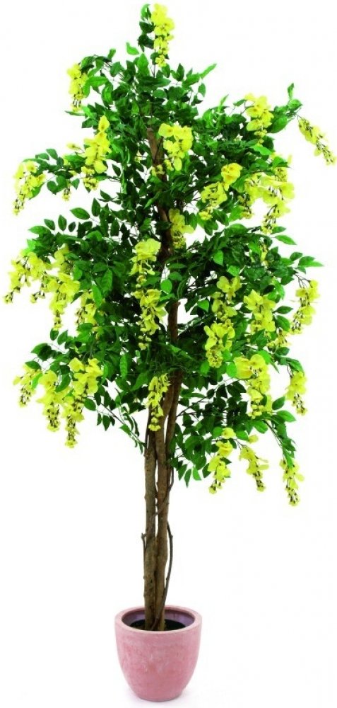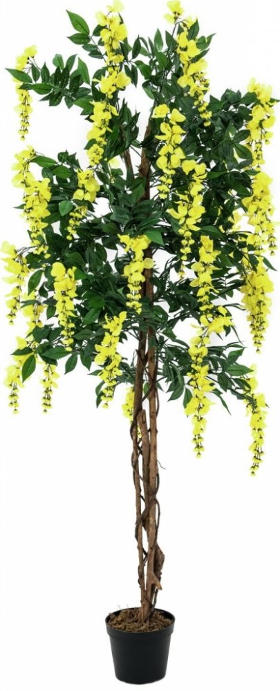 Vistárie umělý kvetoucí strom - zlatý déšť se žlutými květy je vysoký 180cm. Přírodní kmínek s omotanými lianami. Celkem 1365 listů a 819 do detailu propracovaných květů. Dodáváno v kotvícím květináči.