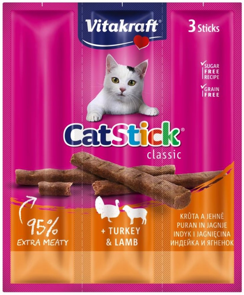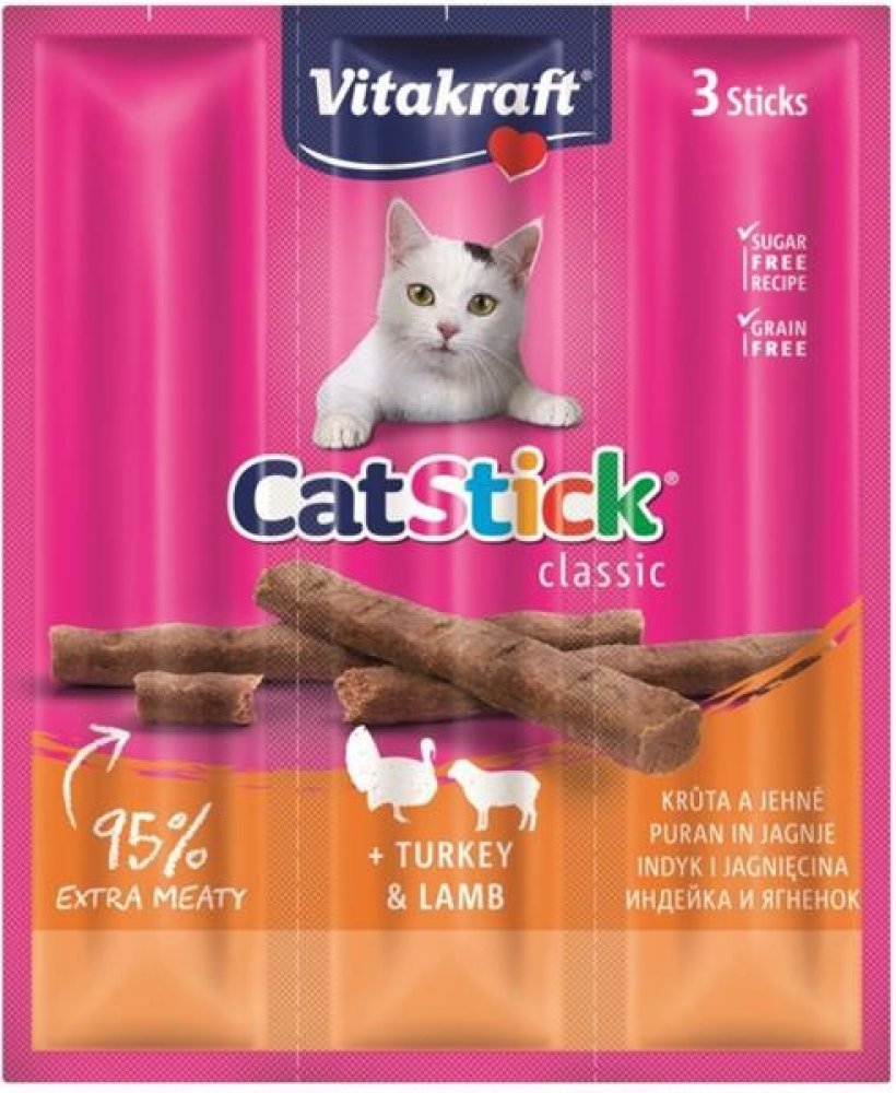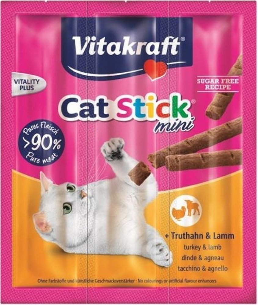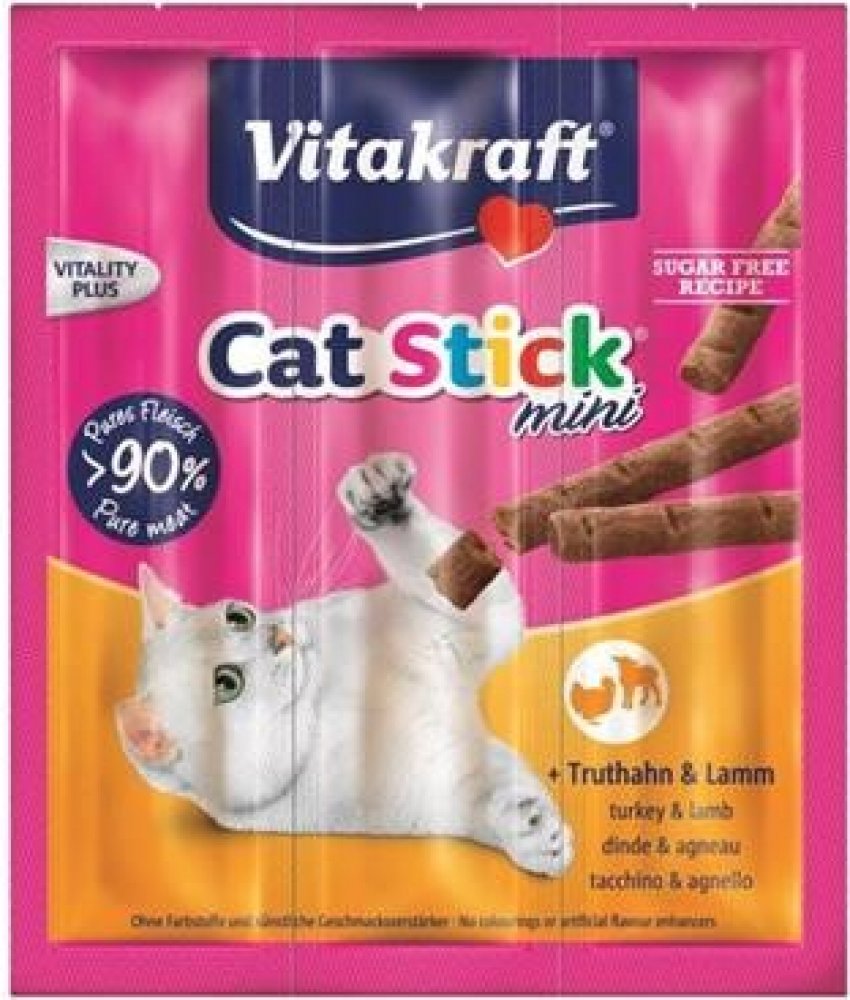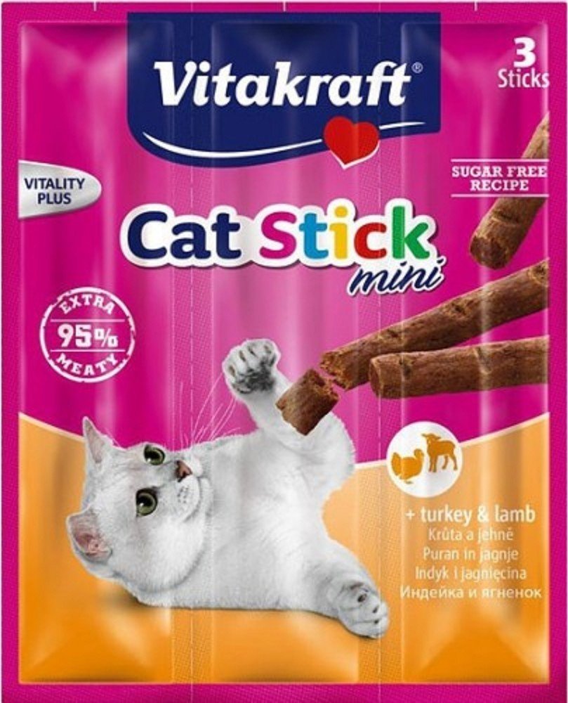 Chutné pamlsky pro kočky Vitakraft Cat Stick Mini přesvědčí svým vysokým podílem masa a jedinečnou vydatnou chutí krůtího a jehněčího masa. Neodolatelná chuť a lahodná vůně dělají z masových tyčinek ideální odměnu pro vašeho mourka.