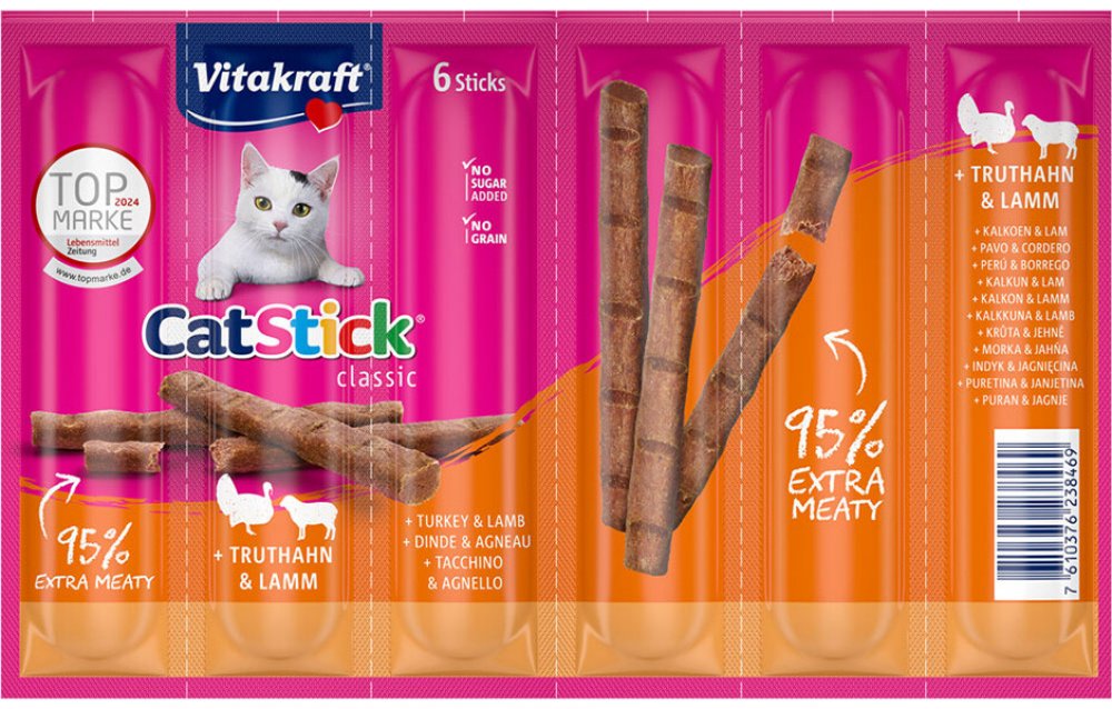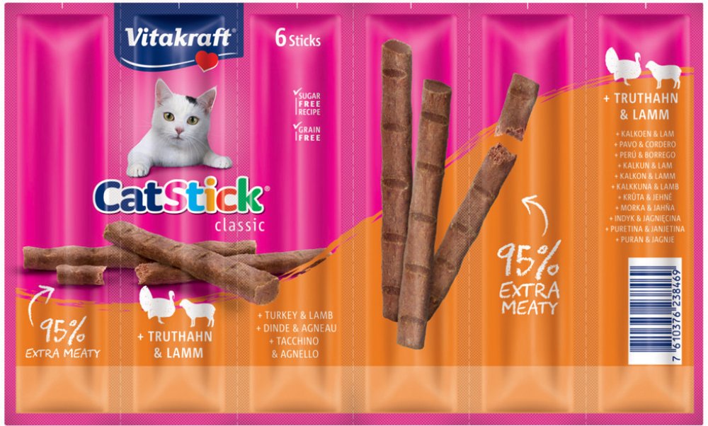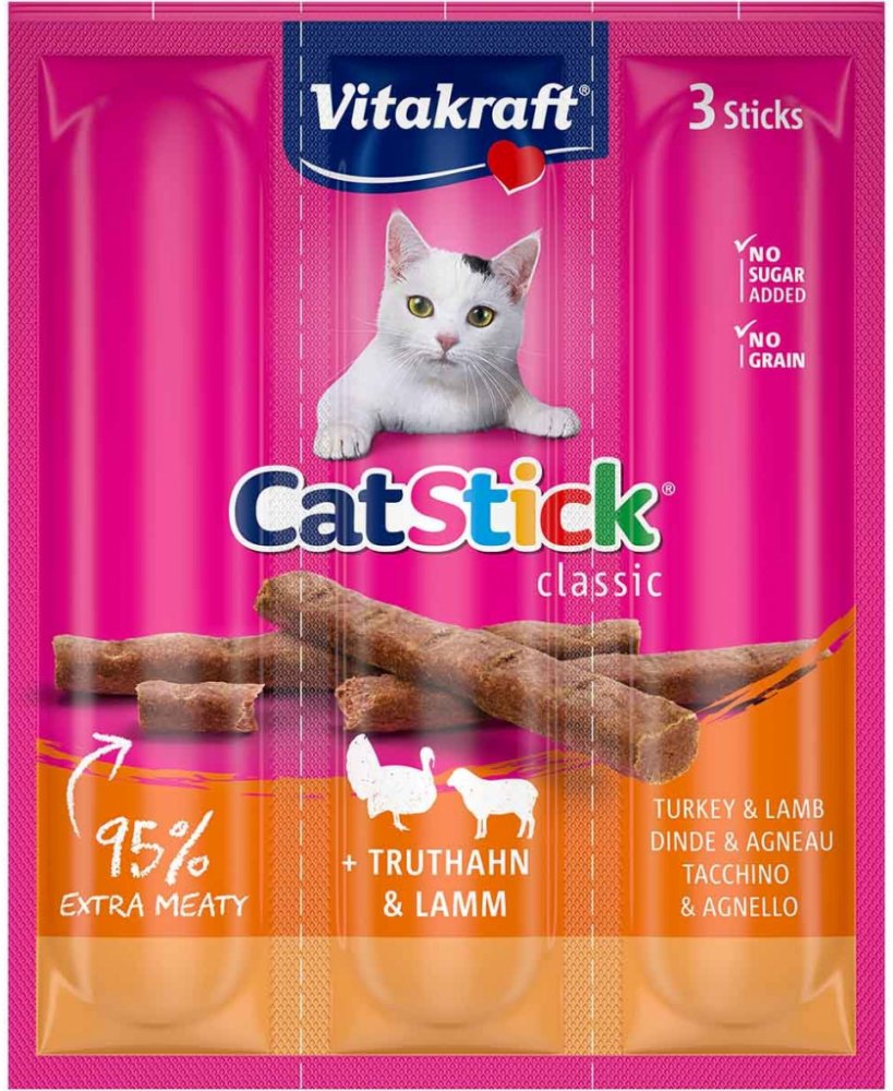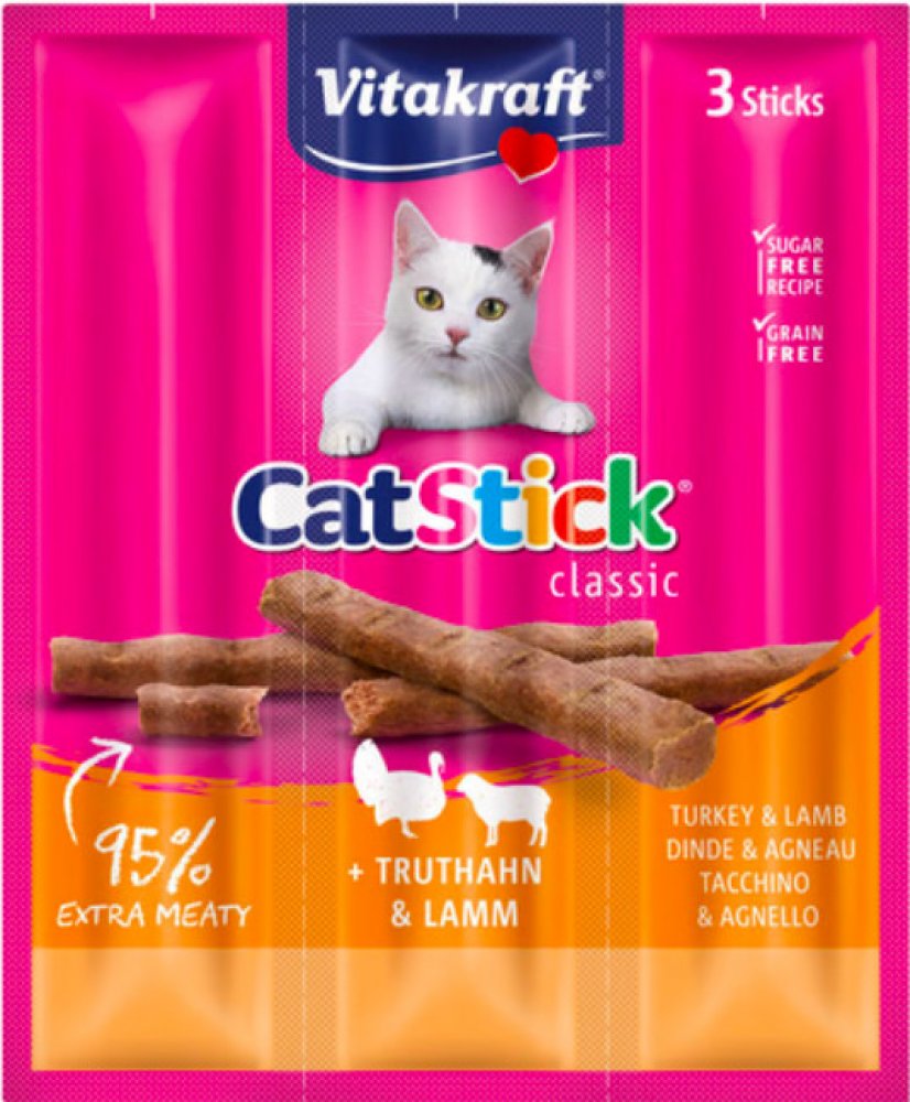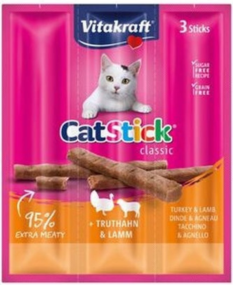 Chutné pamlsky pro kočky Vitakraft Cat Stick Mini přesvědčí svým vysokým podílem masa a jedinečnou vydatnou chutí krůtího a jehněčího masa. Neodolatelná chuť a lahodná vůně dělají z masových tyčinek ideální odměnu pro vašeho mourka.