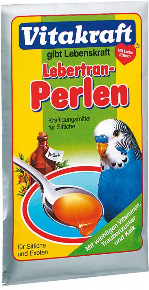 Perličky s olejem z tresčích jater jsou doplňkové krmivo pro andulky.