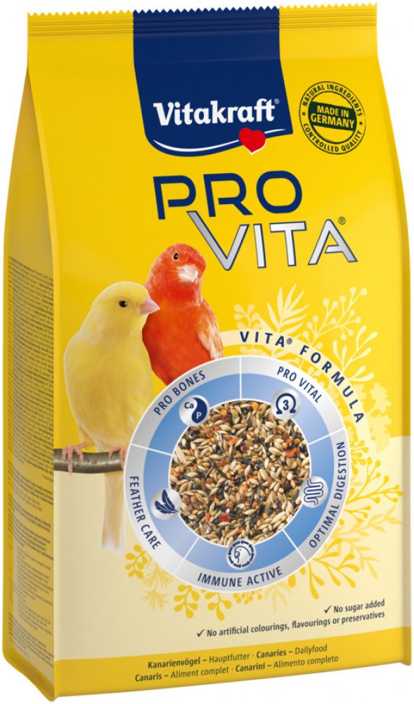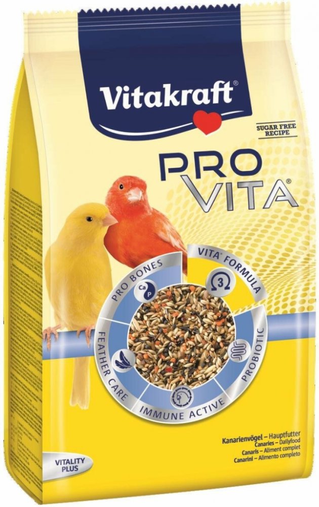 Hlavní vlastnosti krmiva pro ptáky Vitakraft Pro Vita kanár 800 g Dejte ptáčkům jen to nejlepší s krmivem pro ptáky Vitakraft Krmivo je ideální pro kanárky Jedná se o kompletní krmivo se všemi potřebnými látkami Krmnou směs Vitakraft si vaše zvířátko zamiluje Pravidelným užíváním podpoří zbarvení peří Pozitivně ovlivňuje přepeřování a růst nového peří Podporuje dobré trávení Probiotika a prebiotika upravují střevní mikroflóru Hmotnost krmiva pro ptáky činí 0,8 kg V balení obdržíte jeden kus krmiva pro ptáky