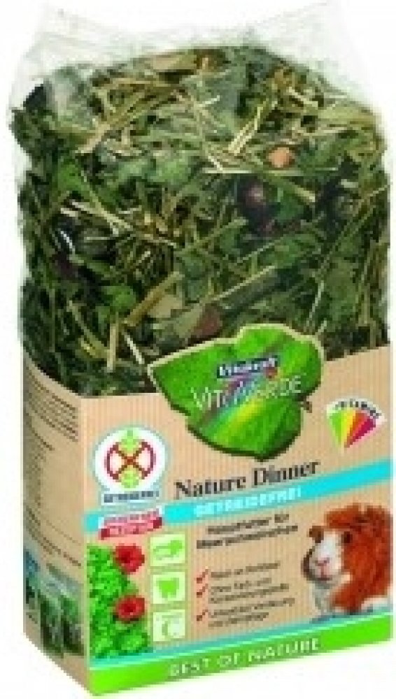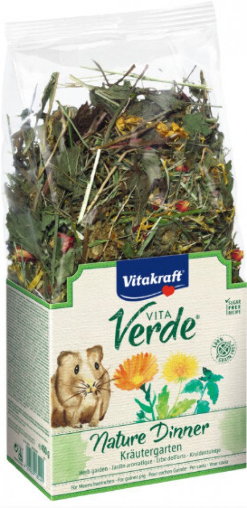Kompletní krmivo pro morčata. 400g Pro přirozenou stravu bez obilovin! Zdravá petržel, lahodná pampeliška... tato směs bohatá na vlákninu obsahuje to nejlepší z bylinkového záhonku a je zjemněná chutnými květy; dodává v optimálním množství extra porci vitamínu C. bez přidaného cukru bez umělých barviv bez umělých dochucovadel bez konzervačních látek - Složení: vedlejší výrobky rostlinného původu, źelenina, sušený měsíček lékařský 5 %, sušená petržel 5 %, sušená pampeliška 4 %, máta peprná 3 %, lístky růží 1 %, minerály. Analytické složky: 20,5 % hrubá vláknina, 12000 I. U. vit. A, 900 I. U. vit. D3, 639 mg vit. C, 0,24 mg selen, 45 mg železo, 0,9 mg jód, 12 mg měď, 75 mg zinek, 36 mg mangan.