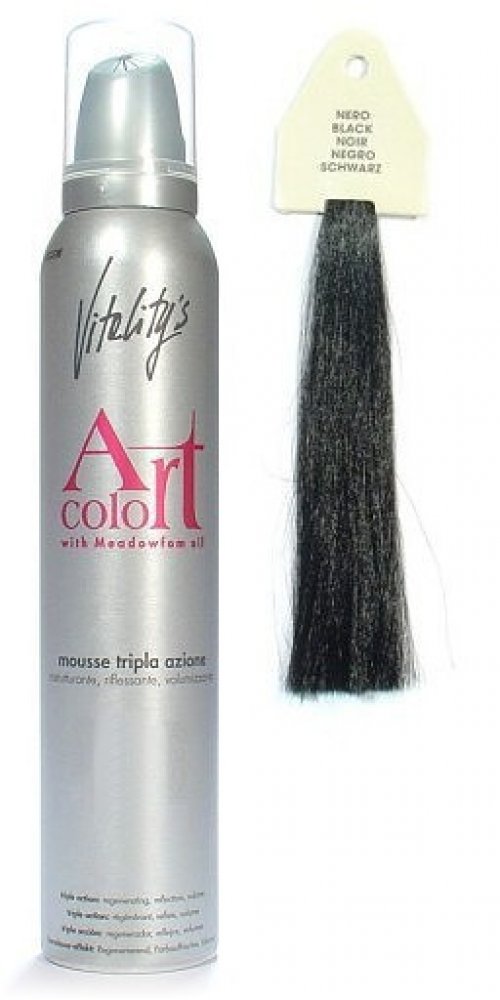 Vitalitys Art Color Mousse Barevné pěnové tužidlo Black 200mlVitalitys Art Color Mousse byla speciálně navržena tak, aby Vašim vlasům umožnila získat:- zářivý lesk a vitalitu- tvar a objem- restrukturalizaci a hydrataci- antioxidanty a anti-aging efektVitalitys Art Color Mousse je ideálím řešením pro obnovu barvy a lesku vlasů, oživení barvy mezi barvením, eliminaci šedých a žlutých tónů, zakrytí prvních šedin, dodání života vybledlým vlasům, zajištění tvaru, objemu a jemnosti bez zatížení, posílení struktury vlasů a ochranu před vnějšími oxidačními látkami.Použítí: Vlasy umyjte a důkladně vysušte ručníkem. Zvolte odstín, který je vhnodný pro vaši barvu. Dobře protřepejte a vydejte dostatečné množství, láhev držte směrem dolů. Pěnu nanášejte rovnoměrně a rozčesávejte po celé délce. Po nanesení nechte zaschnout a nevyplachujte.