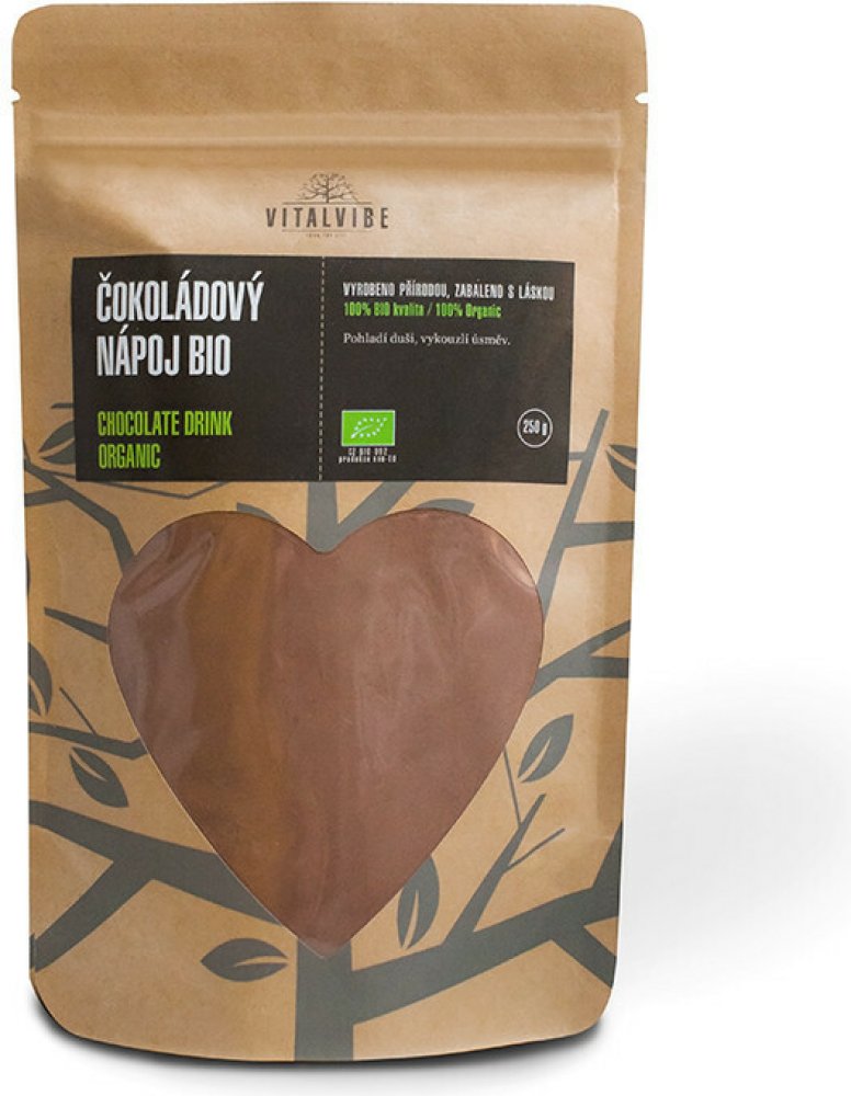 100% přírodní produkt bez aromat, konzervantů a umělých přísad. Slazeno kokosovým cukrem s nízkým glykemickým indexem místo rafinovaného cukru. Snížený obsah tuku oproti běžnému kakau nebo čokoládě. Bohatý na minerály – draslík, fosfor, hořčík, železo. BIO certifikace z kontrolovaného ekologického zemědělství. Česká značka Vitalvibe s tradicí přírodní výživy.