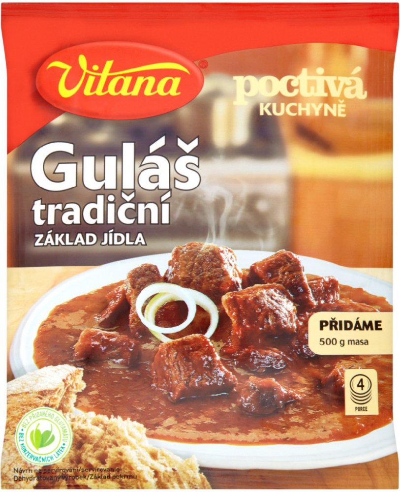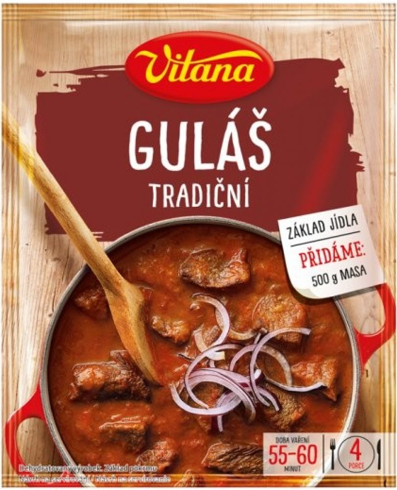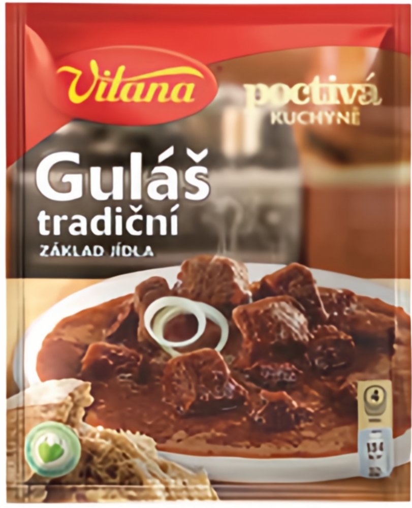 Základ jídla, Doba vaření 55-60 minut, 4 porce Dehydratovaný výrobek. Základ pokrmu. Složení: Pšeničná mouka, Cibule sušená mletá, Jedlá sůl, Cibule sušená řez, Vepřové sádlo, Paprika sladká mletá 4 %, Aromata (obsahují lepek), Sušený sójový hydrolyzát, Směs koření, Barvivo amoniakový karamel Může obsahovat stopy vajec, mléka, celeru a hořčice. Alergeny jsou označeny tučným písmem. Výživové údaje na 100 g / 1 porce 200 g: Energie 386 kJ/91 kcal 772 kJ/183 kcal Tuky 1,6 g 3,3 g - z toho nasycené mastné kyseliny 0,4 g 0,8 g Sacharidy 4,2 g 8,5 g - z toho cukry 0 g 0,1 g Bílkoviny 14,7 g 29,4 g Sůl 0,9 g 1,8 g Přidáme:500 g masa Návod k přípravě:1 500 g nesoleného masa (vepřového či hovězího) nakrájíme na kostky a prudce opečeme na sádle nebo na oleji.2 Vsypeme obsah sáčku, důkladně promícháme a ihned přidáme 500 ml vlažné vody.3 Vaříme pozvolna pod pokličkou, za občasného míchání, dokud není maso měkké (asi 55-60 minut). Stejným způsobem můžeme připravit guláš v tlakovém hrnci. V tomto případě přidáme pouze 300 ml vlažné vody a vaříme mírným varem asi 20 minut. Skladování: Skladujte v suchu. Po přípravě ihned spotřebujte. Výrobce: Orkla Foods Česko a Slovensko a.s., Mělnická 133, 277 32 Byšice, Česká republika