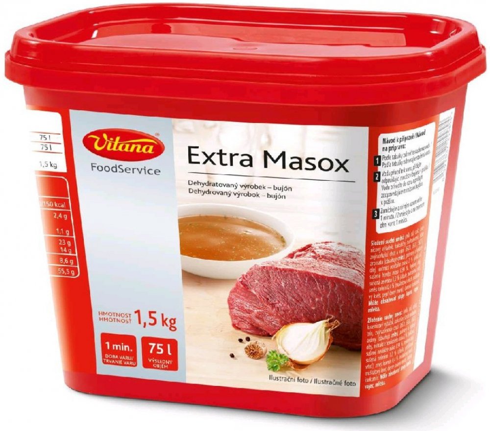 Extra Masox. Dehydratovaný výrobek, bujón. Pro přípravu 75l vývaru/ 300 porcí.