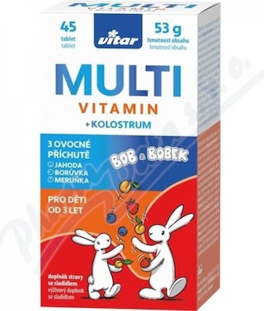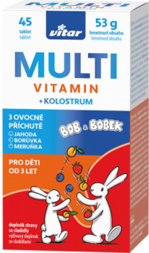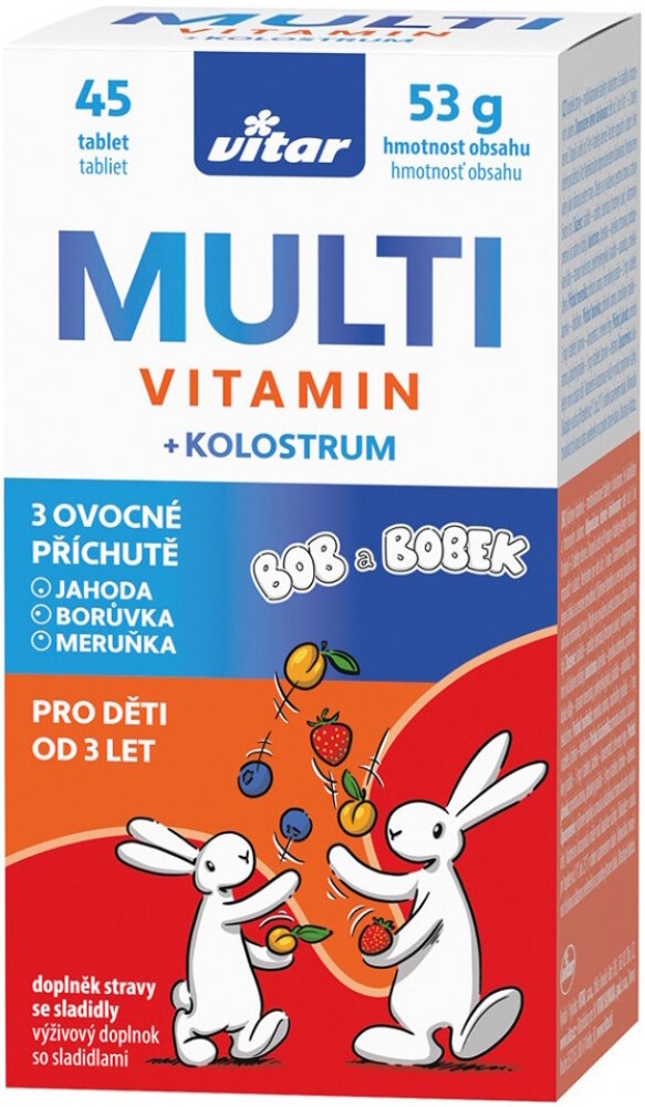 Vitar Kids Multi a kolostrum je doplněk stravy ve formě ochucených tablet pro děti od 3 let. Produkt obsahuje kolostrum, biotin, vitamin B1, B2, B6, B12, C, E, D3, nikotinamid, kyselina pantotenová a listová. Tablety mají meruňkovou, borůvkovou a jahodovou příchuť.