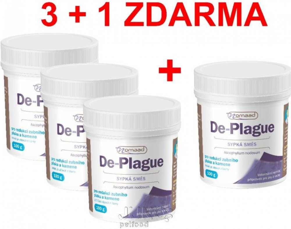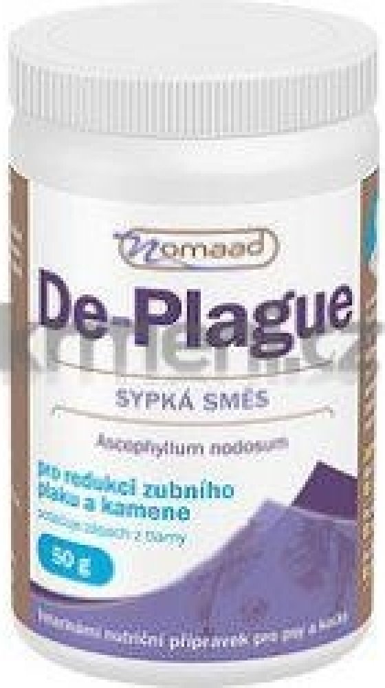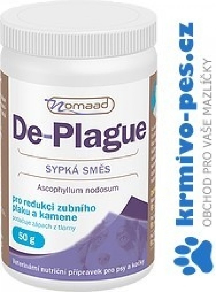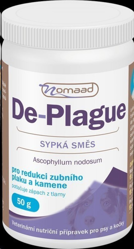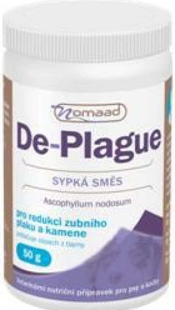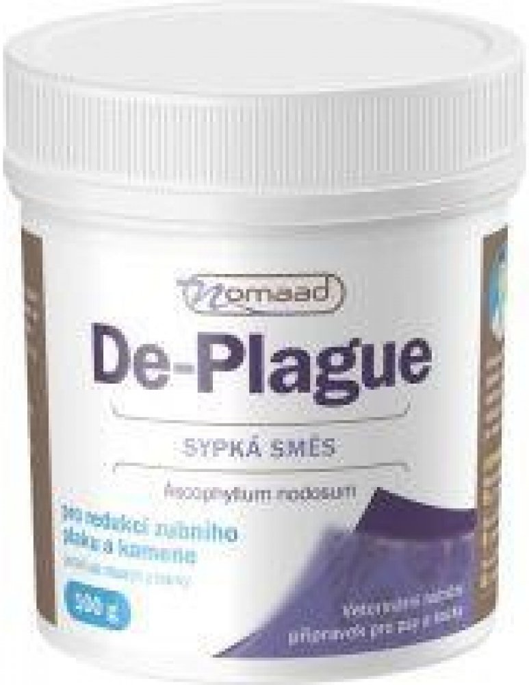 Přírodní přípravek Nomaad De-plague obsahuje mořskou řasu Ascophyllum nodosum pro redukci zubního plaku a kamene, navíc výrazně snižuje zápach z tlamy u psů a koček. Preparát působí přímo v zažívacím traktu zvířete, odkud se následně dostává do krevního řečiště, poté do slin a tím velmi účinně působí na zuby a dásně. Významně ovlivňuje schopnost zachycování bakterií způsobujících zubní plak a změkčuje existující zubní kámen, který většinou sám odpadne nebo je velmi snadno odstranitelný.