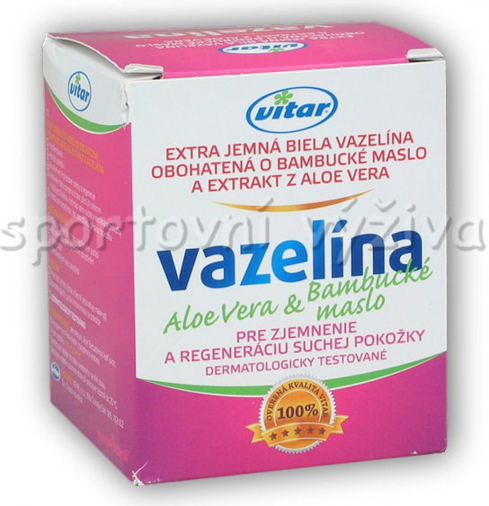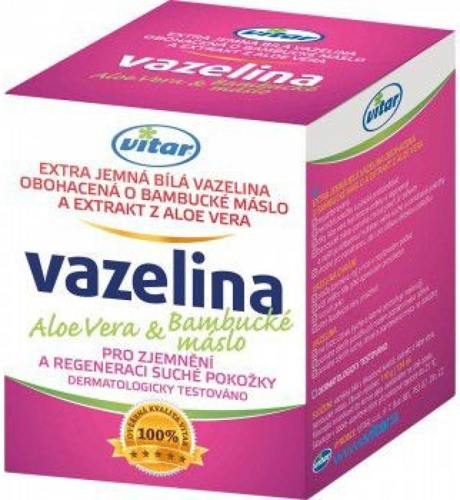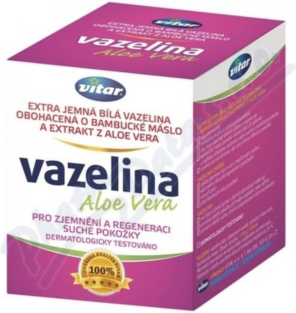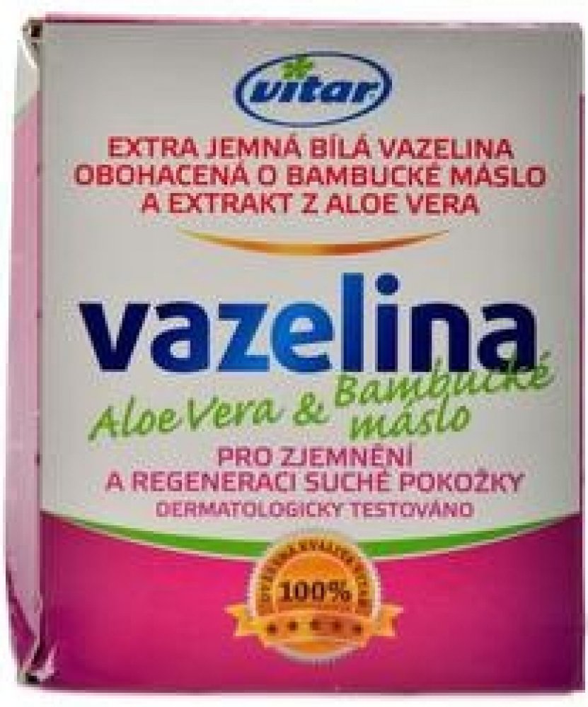 Vitar Vazelina Aloe Vera extra jemná bílá vazelina obohacená o bambucké máslo a extrakt z Aloe vera vhodná pro zjemnění a regeneraci suché pokožky. Je neparfemovaná, nedráždí pokožku a působí protizánětlivě. Aloe vera hojí drobné oděrky a regeneruje, bambucké máslo pomáhá chránit před UV zářením a zajišťuje důkladnou hydrataci velmi suché a namáhané pokožky. Vhodná i pro citlivou dětskou pokožku.