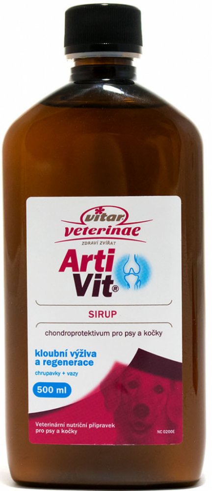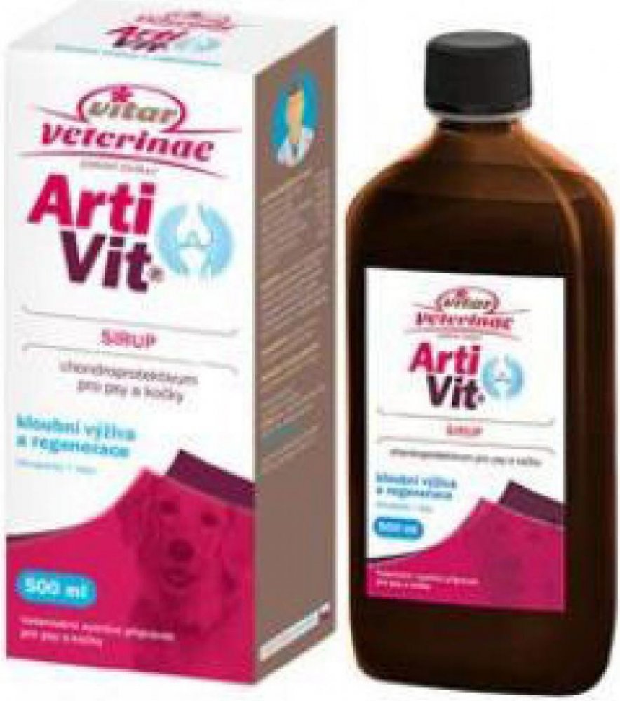 Veterinární nutriční doplněk pro psy a kočky. Kloubní výživa a regenerace kloubních chrupavek a vazů. Sedm synergicky působících účinných látek ve formě sirupu, která umožňuje podávání i při dlouhodobé terapii. Sirup je velmi dobře snášen psy i kočkami. ArtiVit je špičkovou českou kloubní výživou, která pomohla mnoha zvířatům vrátit se zpět do života bez pohybových komplikací.
