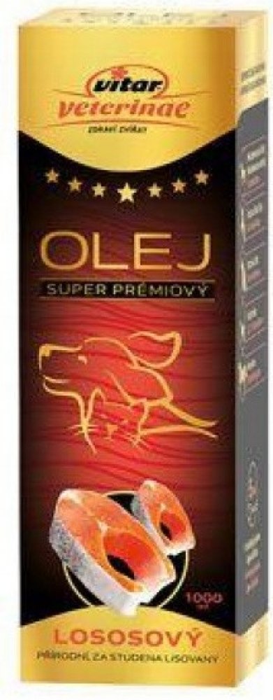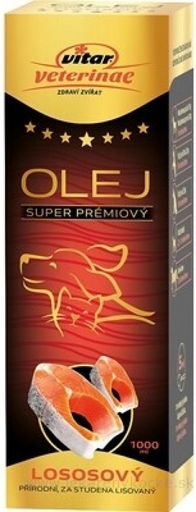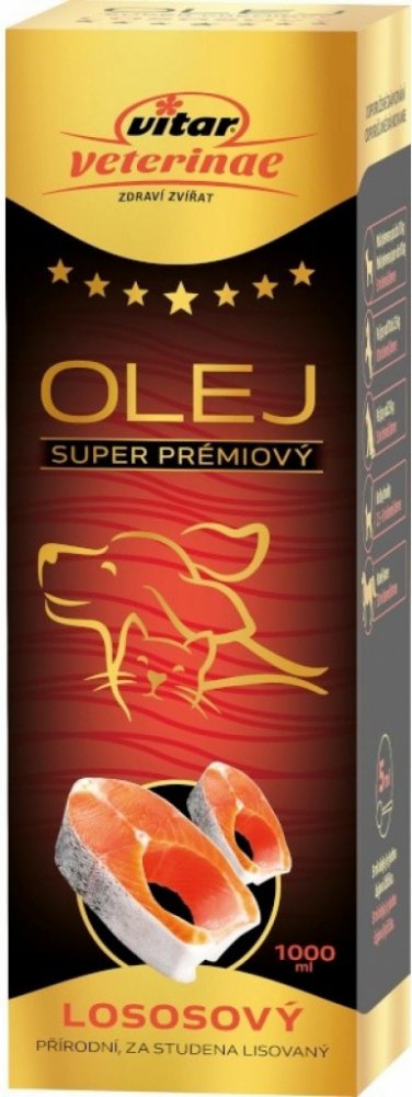 Lososový olej Vitar Veterinae je 100% přírodní doplněk krmiva získaný z kvalitního lososa. Je bohatým zdrojem omega-3 mastných kyselin (EPA a DHA), které přispívají ke zdraví kůže, srsti, srdce, kloubů a imunitního systému. Vhodný pro psy, kočky i další zvířata.