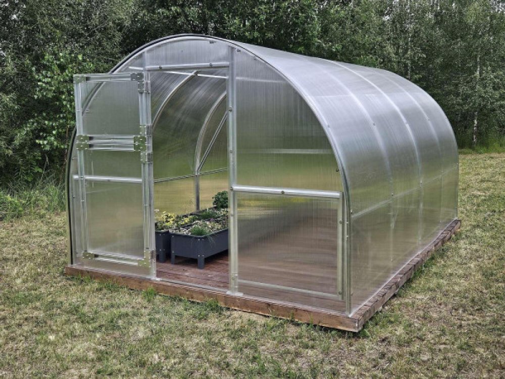 šířka 2,9 m, délky cca 4 / 6 / 8 m, masivní 1 mm silný a 65 mm široký eloxovaný hliníkový profil, rozteč oblouků 100 cm, vnitřní podpěry obloukové konstrukce, dvojité dveře vpředu, ventilační okno vzadu, prosklení nutno vyřezat z dodaných polykarbonátových desek