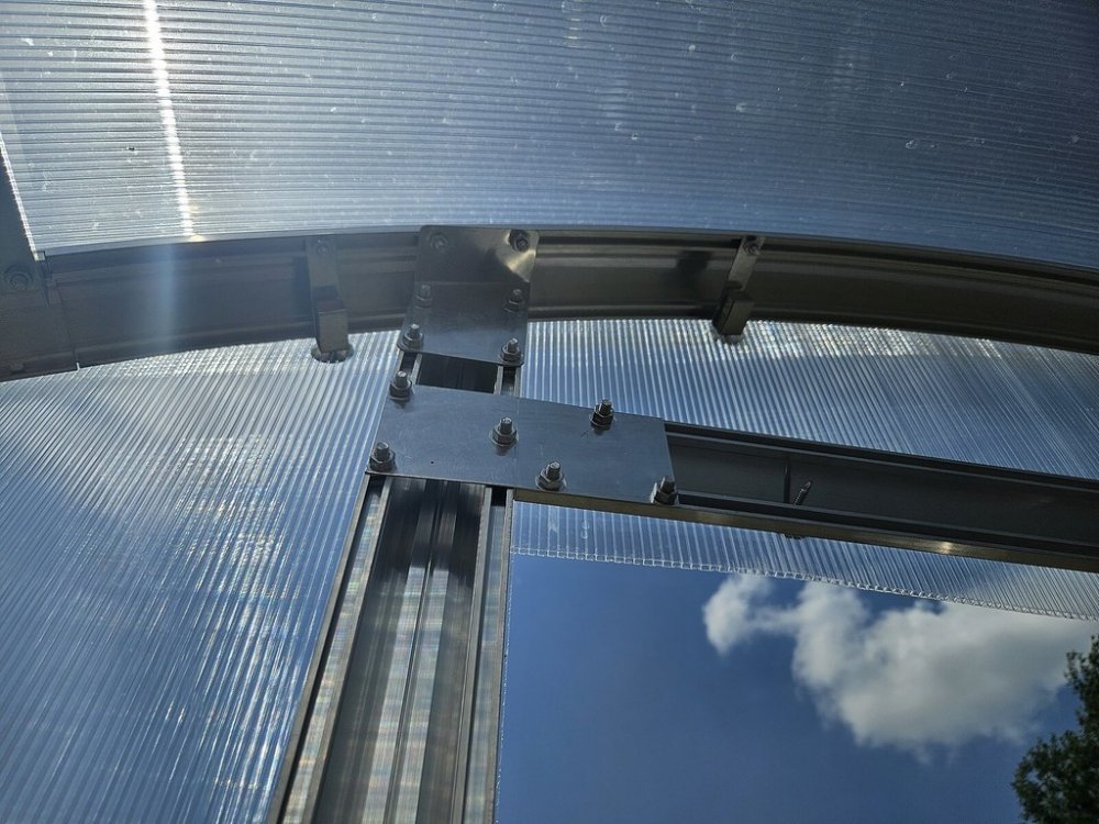 šířka 2,9 m, délky cca 4 / 6 / 8 m, masivní 1 mm silný a 65 mm široký eloxovaný hliníkový profil, rozteč oblouků 100 cm, vnitřní podpěry obloukové konstrukce, dvojité dveře vpředu, ventilační okno vzadu, prosklení nutno vyřezat z dodaných polykarbonátových desek
