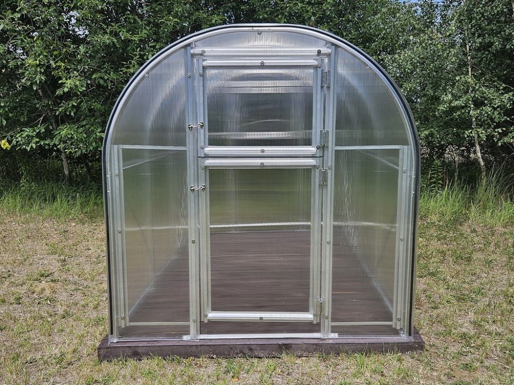 šířka 2,9 m, cca délky 4 / 6 / 8 m, masivní 1 mm silný a 65 mm široký eloxovaný hliníkový profil, rozteč oblouků 100 cm, vnitřní podpěry obloukové konstrukce, dvojité dveře vpředu, ventilační okno vzadu, prosklení nutno vyřezat z dodaných polykarbonátových desek