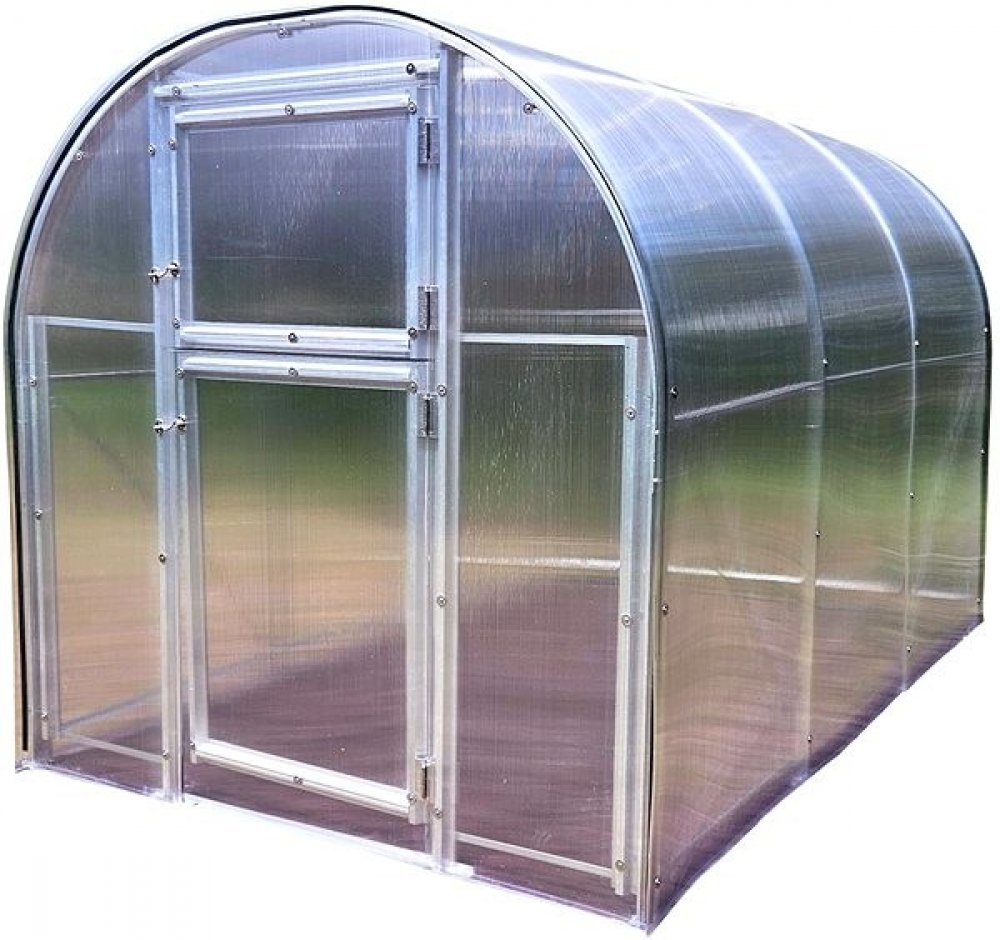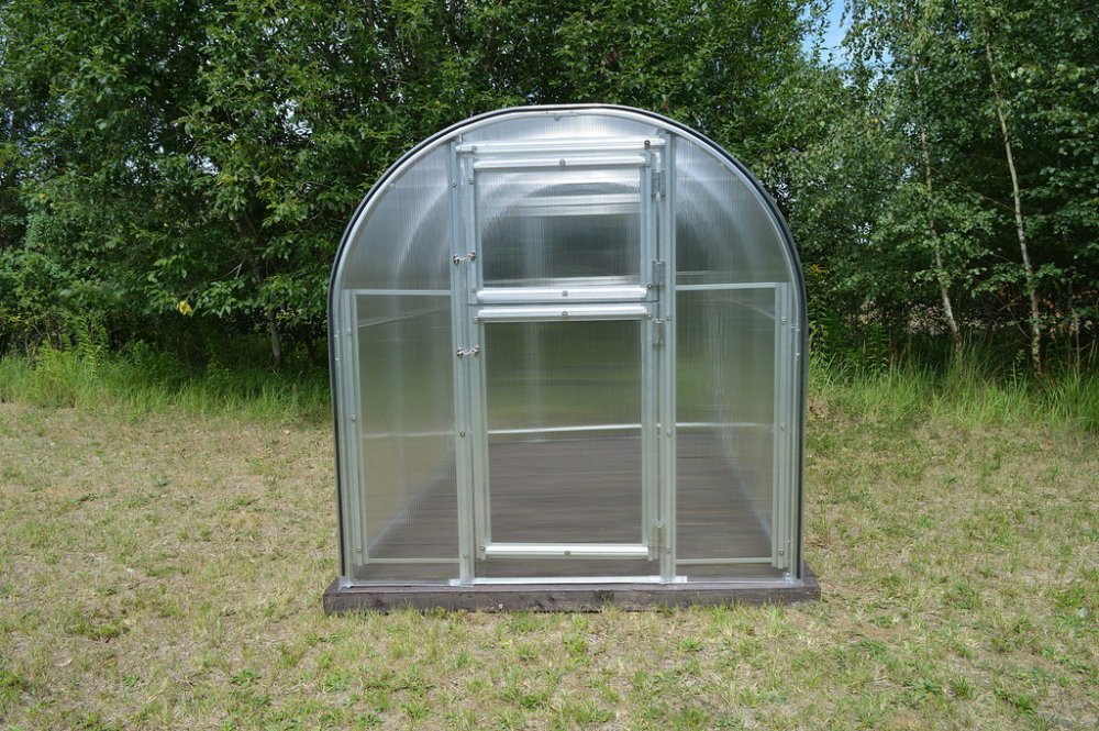 Konstrukce skleníku je sešroubovaná z masivních 1 mm silných a 65 mm širokých eloxovaných hliníkových profilů. Všechny šroubované spoje jsou z hliníkových šroubů a matek, panty a petlice jsou vyrobené z nerezové oceli, takže se jedná o korozi absolutně odolný skleník. Jednotlivá žebra nosných oblouků jsou od sebe vzdálena osově 100 cm. Přední čelo má dvoudílné dveře na pantech, zadní čelo obsahuje větrací okénko. Skleník není průchozí. Jako příplatkové příslušenství lze dokoupit různé druhy regálů, teploměry, vlhkoměry apod.