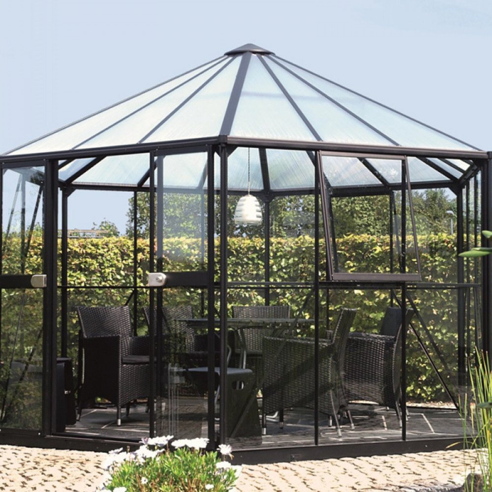 Pavilon HERA 9000 je zařazený do kategorie PREMIUM - skleník je vyrobený značkovým výrobcem z Velké Británie. Pavilon je vyrobený z eloxovaných hliníkových profilů. Prosklení stěn je z klasického čirého bezpečnostního skla síly 3 mm (stěny) a z nerozbitného komůrkového polykarbonátu 6 mm (střecha). Čiré sklo zajišťuje výbornou světelnou propustnost, takže do skleníku je krásně vidět ze všech stran a můžete se kochat barvami pěstovaných rostlin. Kalená verze skla navíc zajišťuje jeho naprostou bezpečnost - v případě rozbití se skleněná výplň roztříští na tisíce malých kousků, což zabrání případnému vážnému zranění. To je velmi důležitá vlastnost skleníku, kterou ocení především rodiče malých dětí pobíhajících po zahradě. Polykarbonát ve střeše - vysoce kvalitní dvoustěnný polykarbonát s UV filtrem (nekřehne, nežloutne) od evropského výrobce. Polykarbonát i sklo jsou do hliníkových profilů uchycené pomocí ocelových sponek. Součástí pavilonu je i pozinkovaná ocelová základna o výšce 6 cm. Na nerozbitnost polykarbonátu krupobitím poskytujeme prodlouženou záruku v délce 10 let.