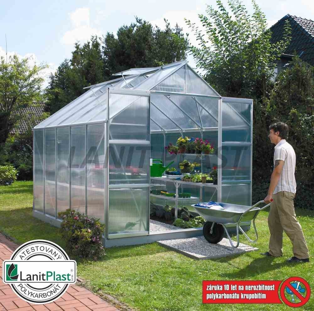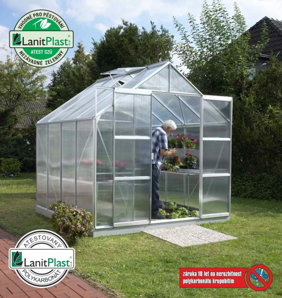 Polykarbonát - prémiový britský dvoustěnný polykarbonát 6 mm se silným UV filtrem (proto na slunci nežloutne a nekřehne). Z důvodu zajištění maximální kvality skleníku dodáváme ke konstrukci prosklení z kvalitního polykarbonátu MARLON (výrobce Brett Martin Velká Británie), který v ČR prošel náročnými testy ve státem akreditovaných zkušebnách jako stavební materiál. Navíc disponuje zkušebním protokolem ze Státního zdravotního ústavu Praha, který potvrzuje, že se z polykarbonátu neuvolňují žádné škodlivé látky. Můžete tak nerušeně pěstovat zeleninu bez obav o své zdraví. Smluvní prodloužená záruka 10 let na nerozbitnost polykarbonátu krupobitím je u skleníků od LANIT PLASTU samozřejmostí.