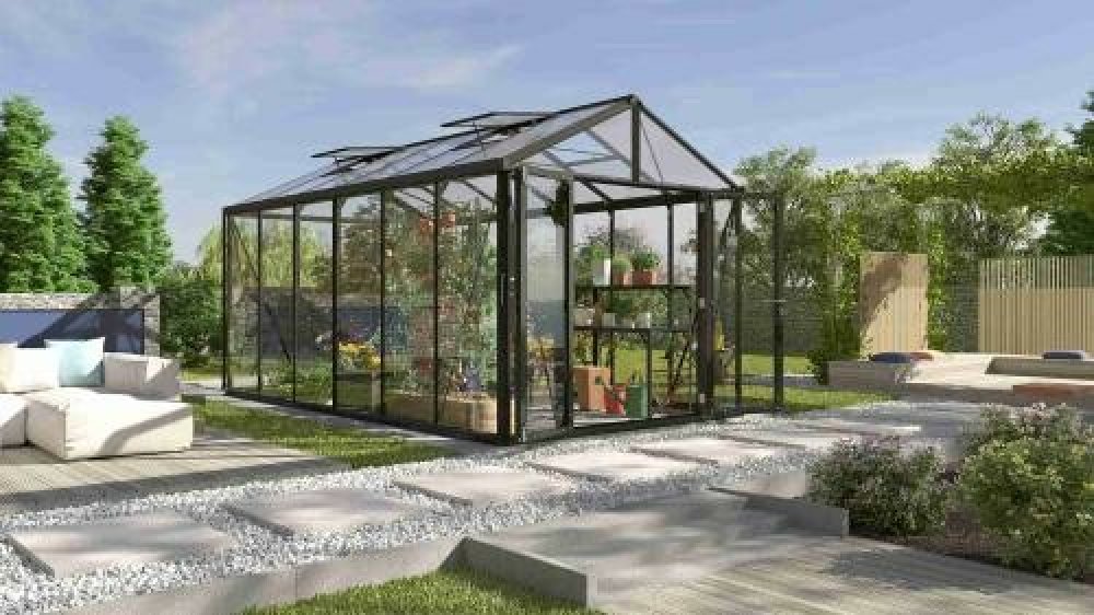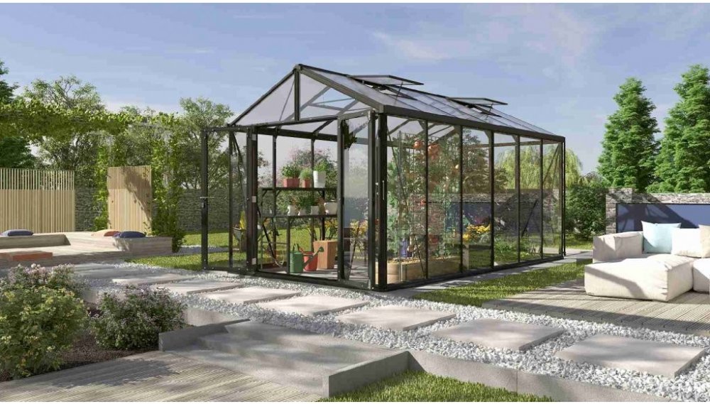 Velký a široký prémiový sedlový skleník z masivních eloxovaných hliníkových profilů a z kaleného skla o síle 3 mm. Prosklení střechy z polykarbonátu o tloušťce až 10 mm. Skleník od renomovaného výrobce VITAVIA GARDEN LTD z Velké Británie. Vhodný i pro pěstovaní exotických rostlin náročných na výkyvy teplot.