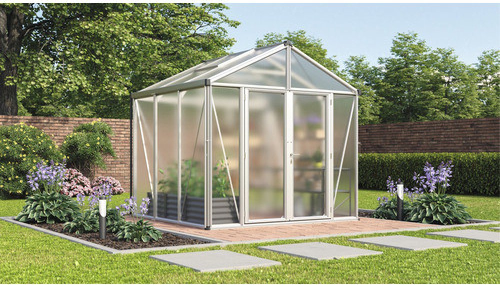 Stabilní konstrukce přesvědčí už na první pohled: Dvojité rámové profily mají robustní vzhled díky zevnitř přišroubovaným hliníkovým lištám, které slouží k upevnění velkoplošných skleněných výplní nebo polykarbonátových dutinkových desek po stranách. Po celé své délce jsou zasazeny mezi rám skleníku a přišroubovanou hliníkovou lištu. Díky tomu je skleník velmi odolný vůči větru. Za tímto účelem je podlahový rám vyroben z robustního jeklového profilu, který lze jednoduše ukotvit do pásového základu v zemi.