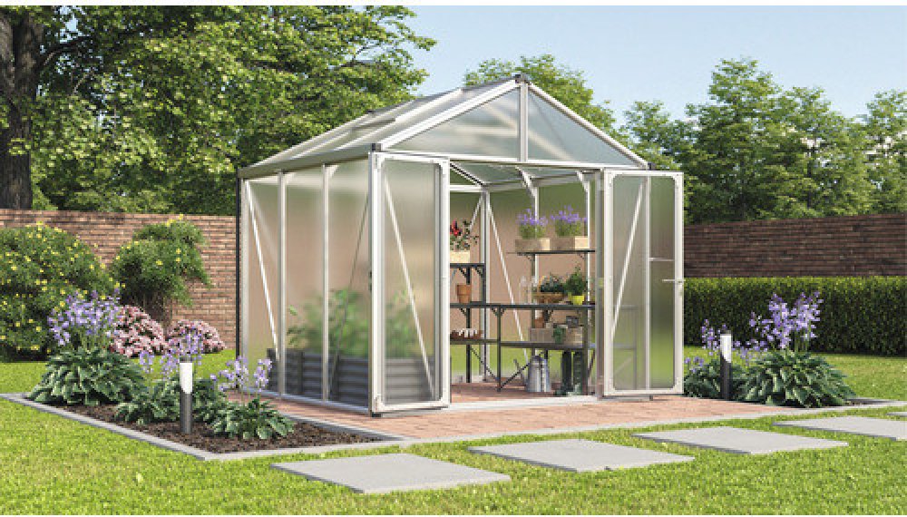 Stabilní konstrukce přesvědčí už na první pohled: Dvojité rámové profily mají robustní vzhled díky zevnitř přišroubovaným hliníkovým lištám, které slouží k upevnění velkoplošných skleněných výplní nebo polykarbonátových dutinkových desek po stranách. Po celé své délce jsou zasazeny mezi rám skleníku a přišroubovanou hliníkovou lištu. Díky tomu je skleník velmi odolný vůči větru. Za tímto účelem je podlahový rám vyroben z robustního jeklového profilu, který lze jednoduše ukotvit do pásového základu v zemi.