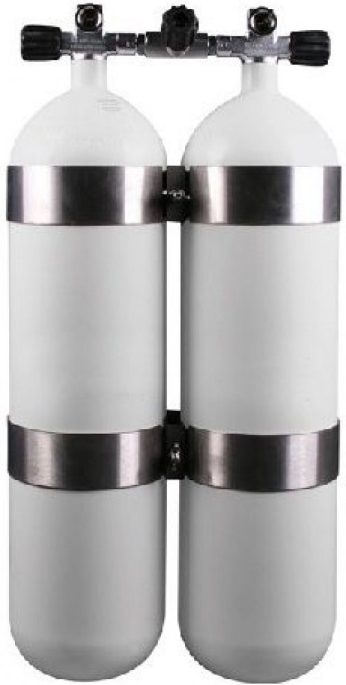 Kompletní sestava dvojče 2x12 L (300 bar) s manifoldem a ocelovými skružemi. Lahev:• objem: 12 L• provozní tlak: 300 bar, testovací tlak: 450 bar• průměr: 178 mm• dno - typ: konvexní (oblé)• hmotnost: 16,7 kg• výška: 650 mm• závit: M25×2• povrchová úprava: metalizace + vrchní nátěr• barva: bíláVentil:Kompletní manifold – pravý a levý ventil s uzavíratelným můstkem• provozní tlak: 300 bar• závit do lahve: M25×2• závit ventilu: DIN G5/8"• gumové točítko• čisté pro EANx• výrobce: San-o-SubSkruže:• průměr: 178 mm• šíře: 80 mm• materiál: ocelHmotnost celého kompletu: cca 38 kg
