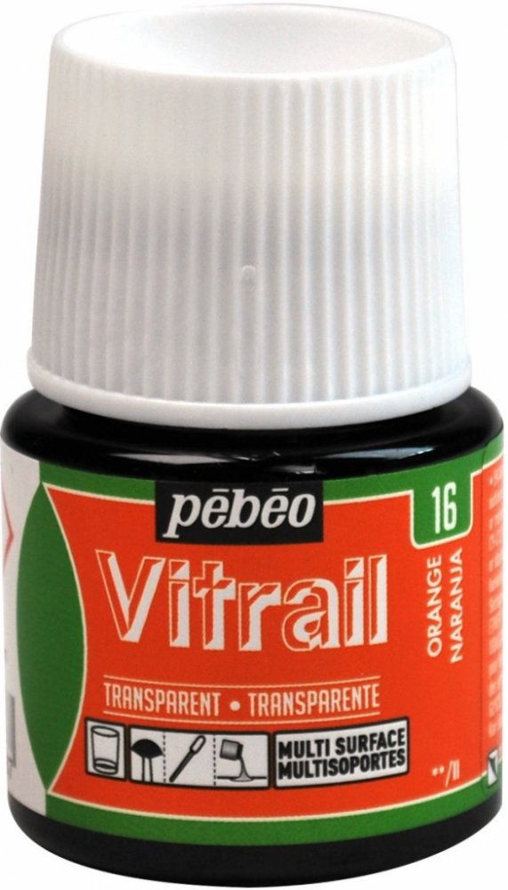 Nevypalovací barva Vitrail značky Pébéo je průhledná, intenzivní, lesklá a velmi zářivá barva nejen na sklo. Nevypalovací barva Vitrail značky Pébéo je průhledná, intenzivní, lesklá a velmi zářivá barva nejen na sklo.Všechny odstíny lze mezi sebou smíchat a vytvořit tak širokou škálu barev. Jedná se o rozpouštědlovou barvu a je možné ji ředit minerálním lihem. PoužitíBarvy jsou připraveny k použití a lze je použít čisté anebo zředěné minerálním lihem.Mohou se aplikovat nejen na sklo, ale také třeba na kov, keramiku, plexisklo, porcelán a další povrchy.K čištění náčiní a příslušenství lze použít minerální líh.Po zaschnutí jsou barvy odolné proti šetrnému mytí a čističům oken. AplikaceBarvy nanášíme na odmaštěný povrch a to nejlépe ve vodorovné poloze.Schnou na vzduchu - na dotek jsou suché během 1 hodiny, kompletně suché během 8 hodin (při průměrném množství nanášení barev). Vypalování není nutné. UpozorněníTyto barvy nejsou určeny ke styku s potravinami!Látka je hořlavá a dráždivá!