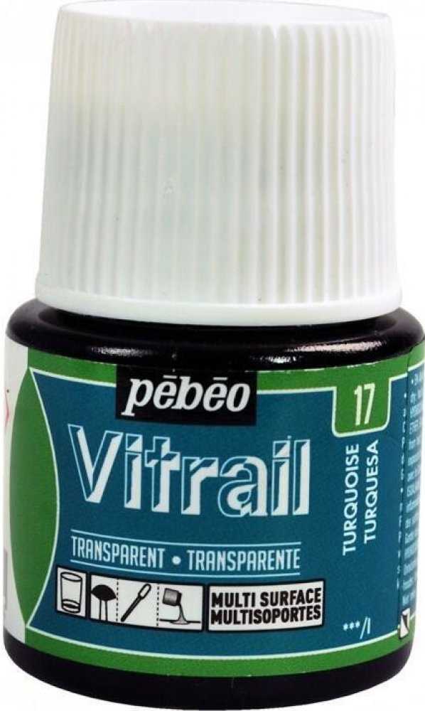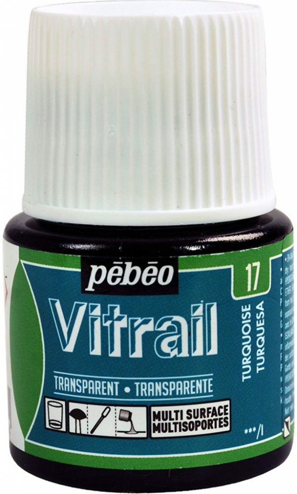 Nevypalovací barva Vitrail značky Pébéo je průhledná, intenzivní, lesklá a velmi zářivá barva nejen na sklo.Všechny odstíny lze mezi sebou smíchat a vytvořit tak širokou škálu barev. Jedná se o rozpouštědlovou barvu a je možné ji ředit minerálním lihem. PoužitíBarvy jsou připraveny k použití a lze je použít čisté anebo zředěné minerálním lihem.Mohou se aplikovat nejen na sklo, ale také třeba na kov, keramiku, plexisklo, porcelán a další povrchy.K čištění náčiní a příslušenství lze použít minerální líh.Po zaschnutí jsou barvy odolné proti šetrnému mytí a čističům oken. AplikaceBarvy nanášíme na odmaštěný povrch a to nejlépe ve vodorovné poloze.Schnou na vzduchu - na dotek jsou suché během 1 hodiny, kompletně suché během 8 hodin (při průměrném množství nanášení barev). Vypalování není nutné. UpozorněníTyto barvy nejsou určeny ke styku s potravinami!Látka je hořlavá a dráždivá!