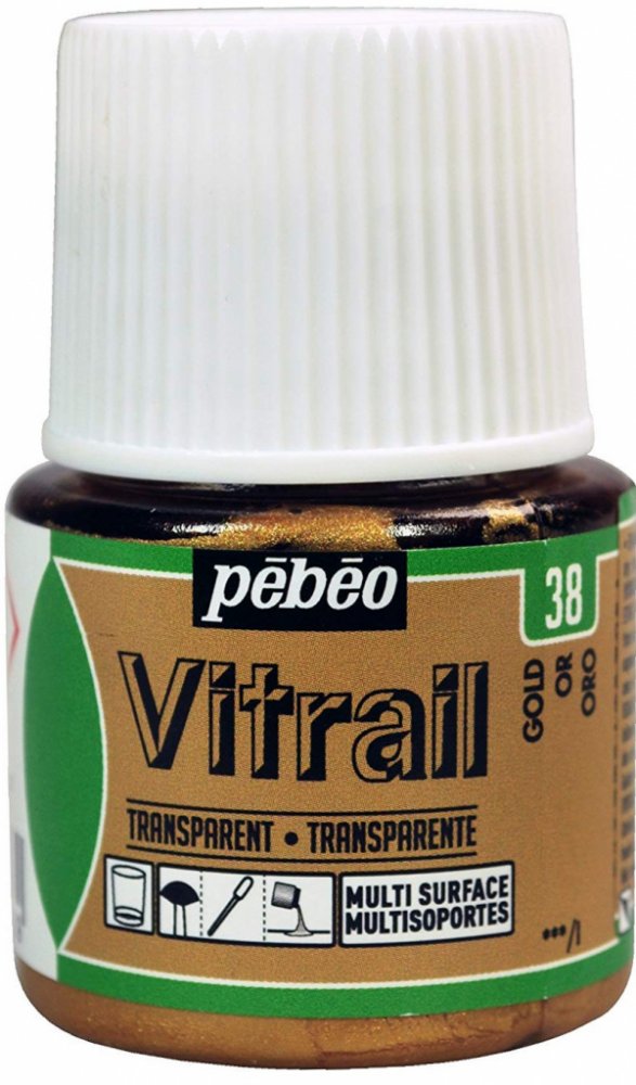 Vitrail 45 ml - různé barvy, 38 - Zlatábarvy Vitrail jsou transparentní, na rozpouštědle založené barvy na sklo, kovy, plexisklo, polyester a další povrchy. Jsou to intenzivní, lesklé a velmi zářivé na vzduchu schnoucí barvy s výbornou odolností proti světlu.