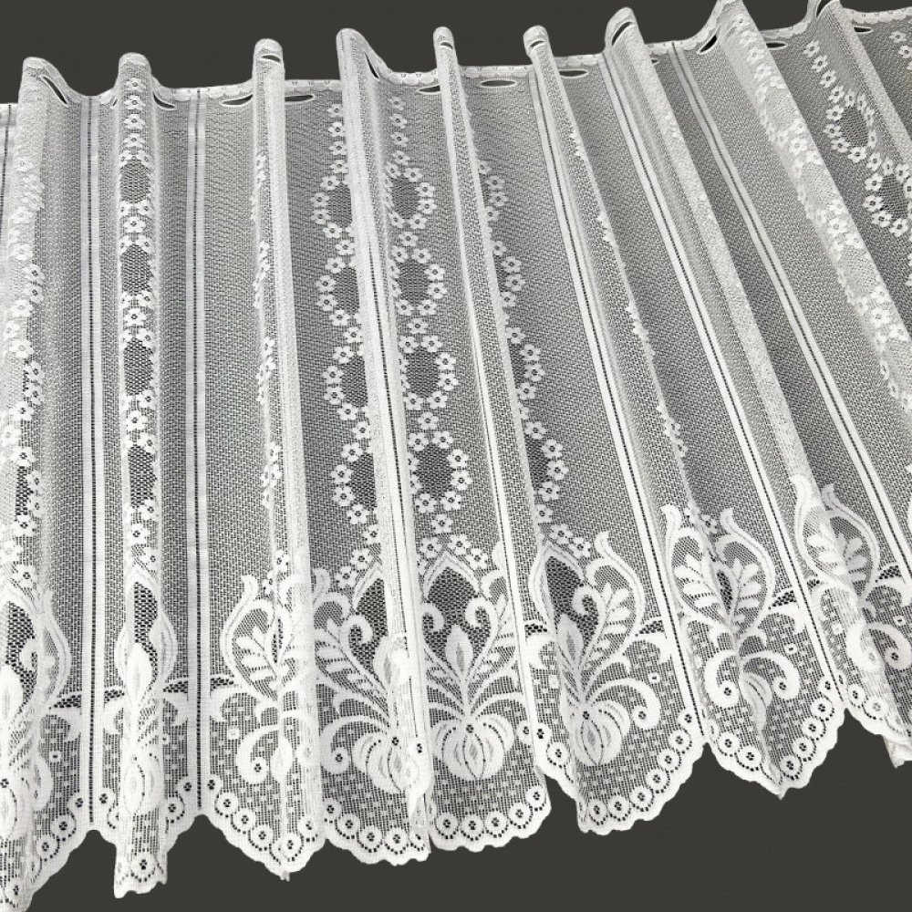 Vitrážová žakárová záclona v bílé barvě se vzorem.