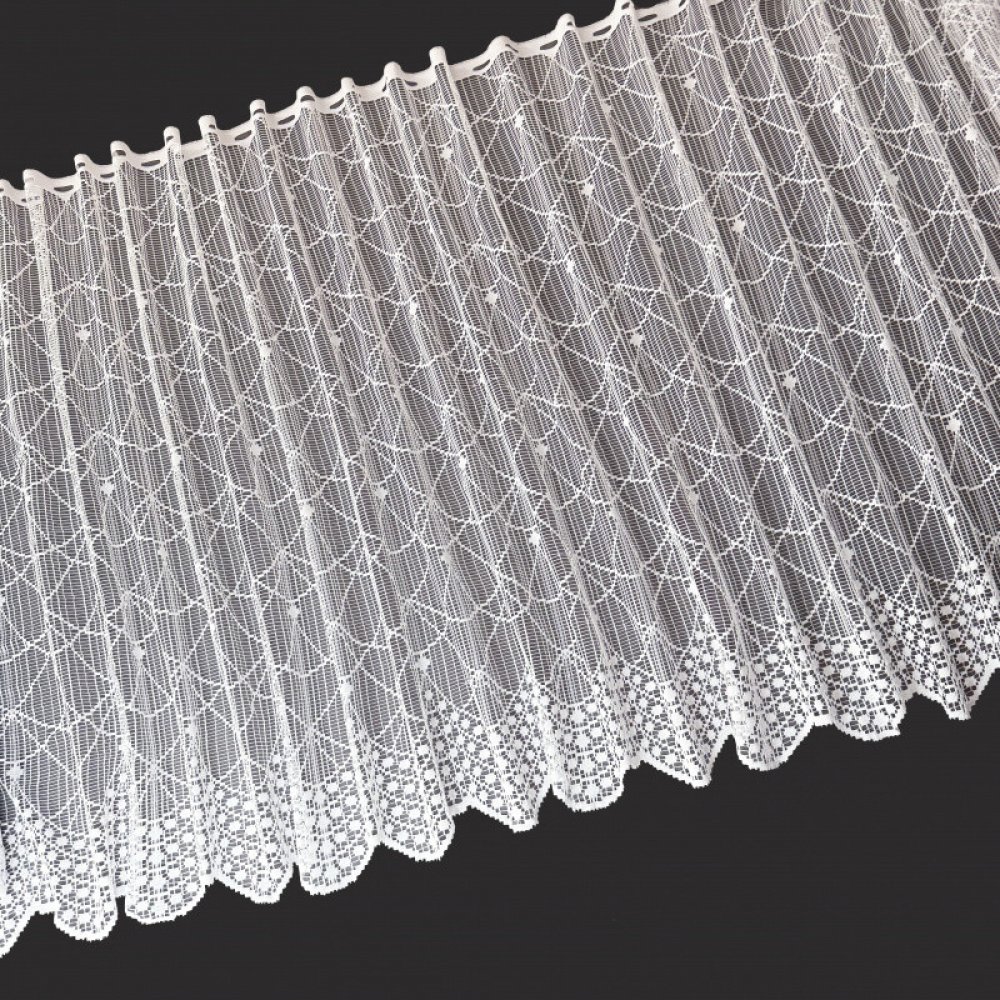 Vitrážová žakárová záclona v bílé barvě se vzorem.