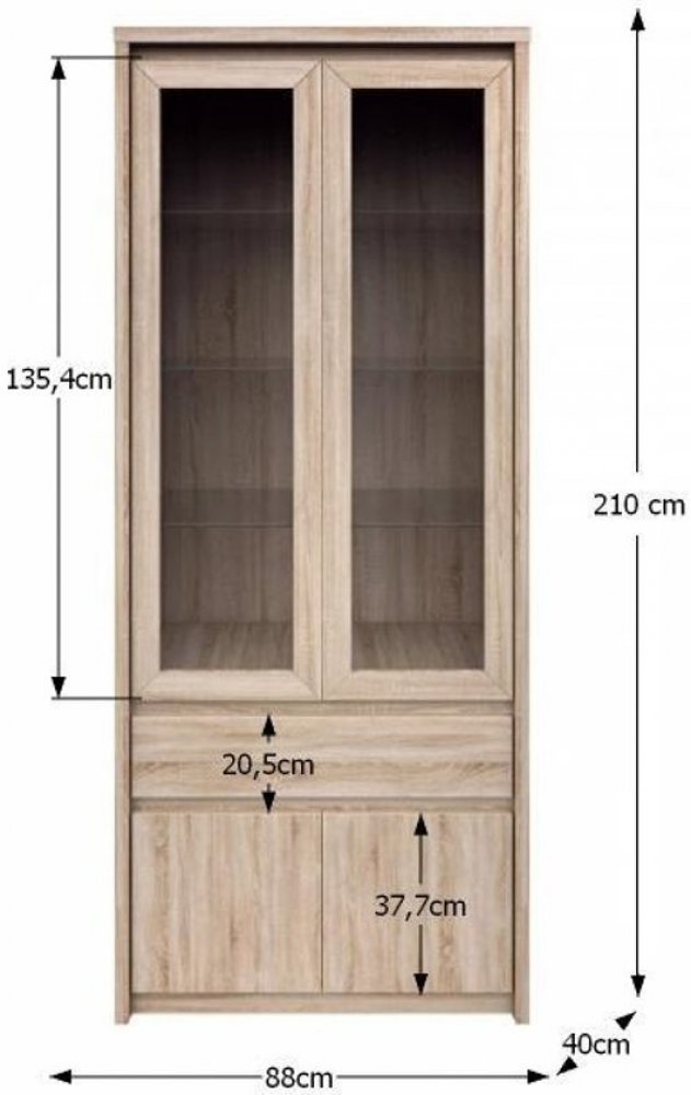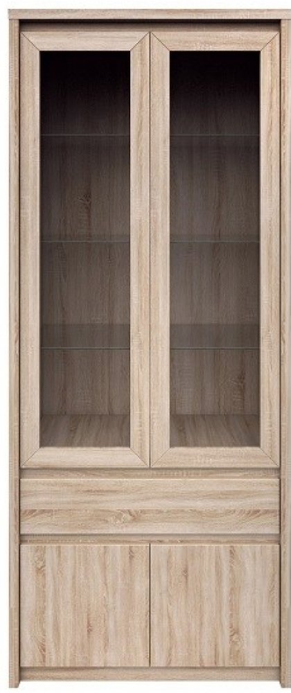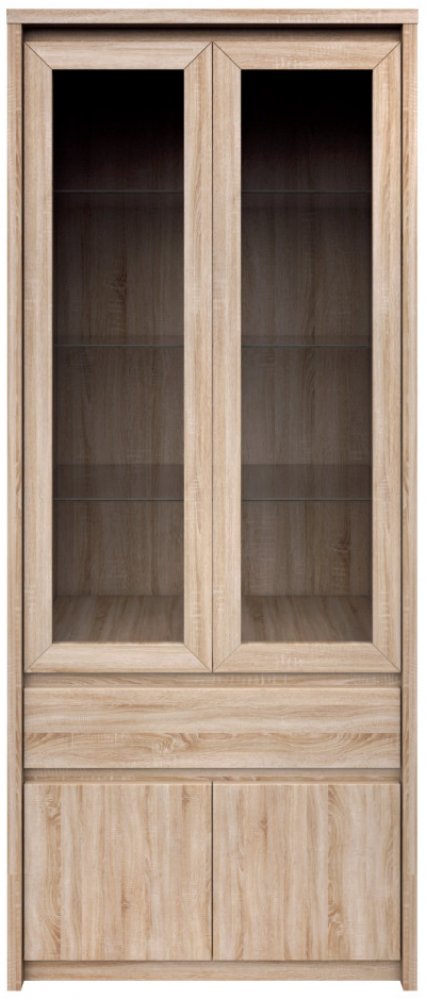 Vitrína z víceúčelového sektorového systému Norty. Vitrínu se 2 prosklenými dveřmi, 2 plnými dvířky a zásuvkou nabízíme z lamina v dezénu dub sonoma. Jednoduché linie a čistý design této kolekce podtrhuje funkcionalitu a univerzalitu pro kteroukoliv místnost ve vašem domově. Libovolně kombinujte produkty z řady Norty(viz související zboží). Rozměry: - šířka 88 cm - hloubka 40 cm - výška 210 cm