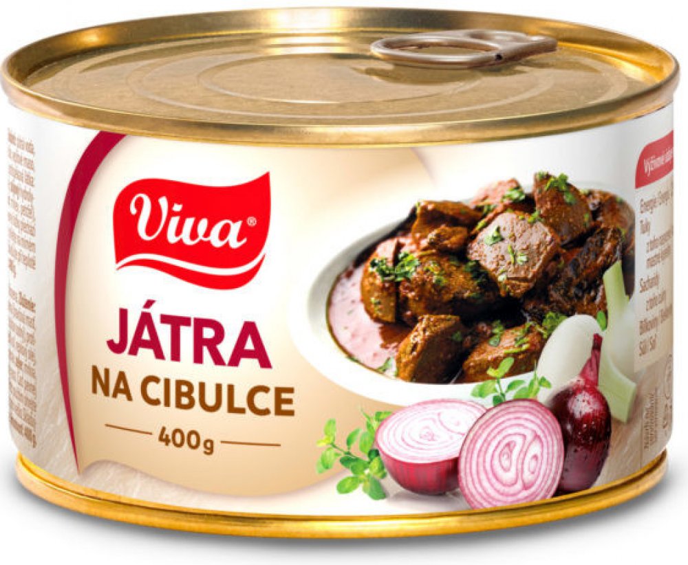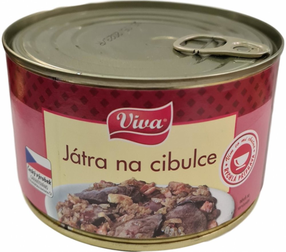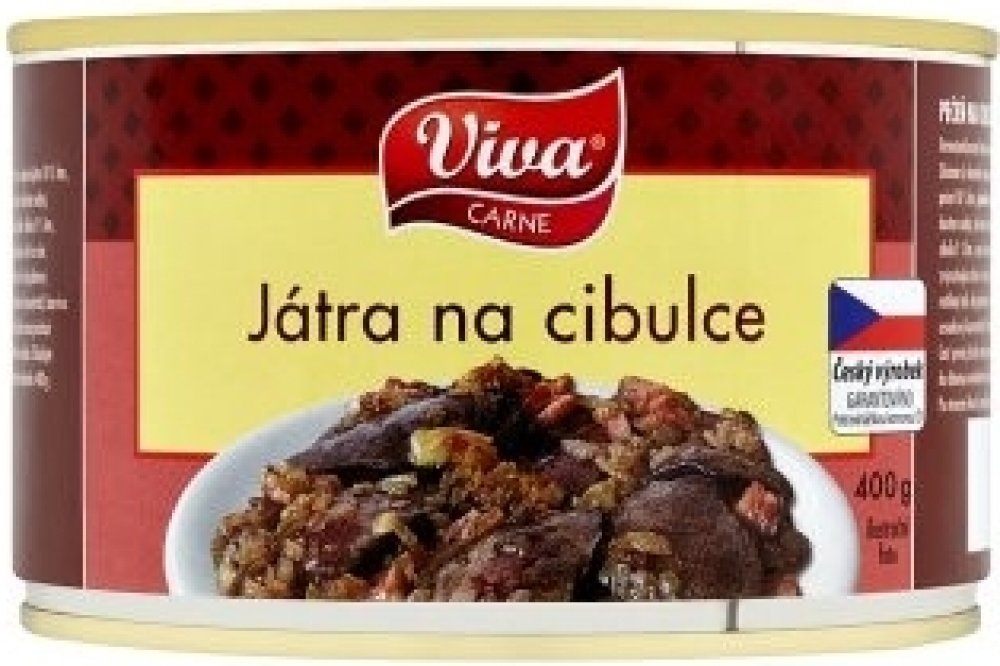 Složení (v okamžiku zpracování): pitná voda, drůbeží játra 20 % hm., vepřová játra 10 % hm., pšeničná mouka, uzená slanina (vepřový bok, sůl jedlá, konzervant: dusitan sodný, dusičnan draselný; antioxidant: askorbát sodný; směs koření); sůl jedlá, cibule 1 % hm., směs koření, kvasnicový výtažek, cukr, maltodextrin, látka zvýrazňující chuť a vůni: glutamát sodný, E 631, E 627; aroma (laktóza, celer); rostlinný tuk, olej palmový a řepkový, hovězí maso (vaječný bílek, rostlinná vláknina, česnekový koncentrát); barvivo: kurkumin.