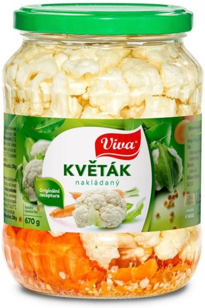 Sterilovaná zelenina dělená v kořeněném sladkokyselém nálevu.Složení:květák 45 , pitná voda, ocet kvasný lihový, cukr, mrkev 5 , jedlá sůl, hořčičné semínko 0,2 , regulátor kyselosti: kyselina citronová, extrakt koření, antioxidant: disiřičitan sodný.Výživové hodnoty na 100g výrobku:Energetická hodnota: 162kJ/39 kcal; tuky 0,2g - z toho nasycené mastné kyseliny 0,0g; sacharidy 7,5g - z toho cukr 7...
