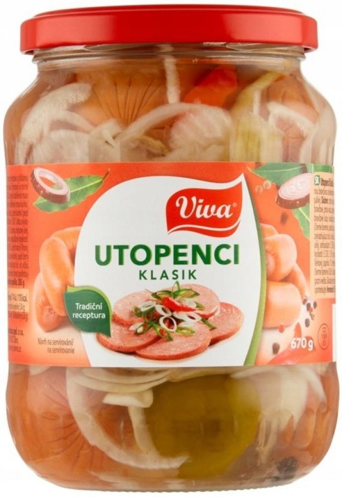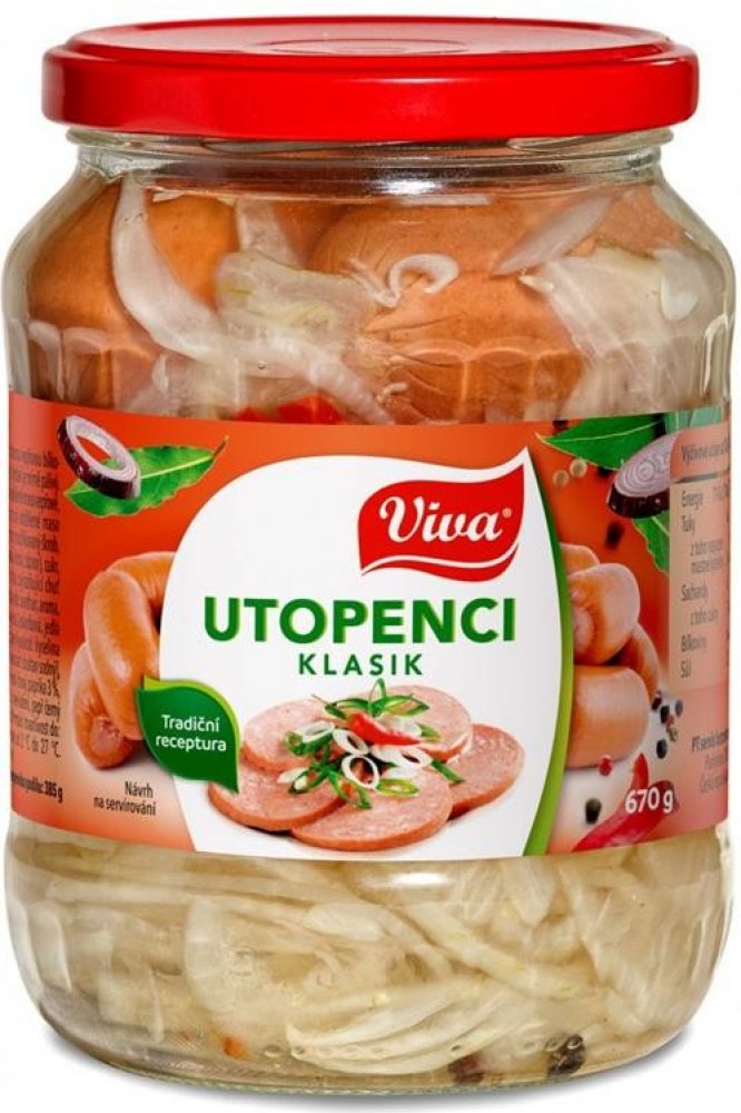 Utopenci Klasik. Sterilovaný masný výrobek s přidanou vepřovou bílkovinou ve sladkokyselém nálevu. Výrobek je mírně pálivý. O VÝROBCIVíme co nám chutná! Jsme významným výrobcem v oblasti paštik, pomazánek, cestovního občerstvení, masných výrobků, hotových jídel, párků a klobás, zeleniny, pochutin, kečupů a pyré. Nabízíme také GASTRO produkty pro výrobny, školní jídelny, veřejné stravování a velkoobchody s potravinami. Ochranná známka VIVA byla zaregistrována v roce 1997 a je značkou pro cca. 400 druhů výrobků společnosti PT servis konzervárna spol. s r. o. Velká část portfolia výrobků VIVA má označení: “Česká potravina – garantováno Potravinářskou komorou ČR “. VÝROBCEPT servis konzervárna spol. s r.o.Purkyňova 1000/4390 02 Tábor SKLADOVACÍ PODMÍNKYSkladujte při teplotě od 2 °C do 27 °C. Po otevření ihned spotřebujte. SLOŽENÍUzenina 32 % [strojně oddělené maso vepřové, pitná voda, vepřové sádlo, strojně oddělené maso kuřecí, vepřové kůže, hovězí maso, modifikový škrob, směs koření (pepř černý, paprika, kmín, zázvor), cukr, stabilizátor: trifosforečnany, látka zvýrazňující chuť a vůni: glutaman sodný, zahušťovadlo: xanthan, aroma, řepkový olej, antioxidant: kyselina L-askorbová, jedlá sůl, vepřová bílkovina, regulátor kyselosti: kyselina citronová, kyselina jablečná; konzervant: dusitan sodný], pitná voda, cibule 20 %, ocet kvasný lihový, paprika 3 %, feferonka 0,2 %, cukr, jedlá sůl, nové koření, pepř černý 0,06 %, bobkový list 0,05 %. VÝŽIVOVÉ HODNOTY ve 100g výrobkuEnergetická hodnota: 714 kJ/170 kcalTuky: 16 gz toho nasycené mastné kyseliny: 5,4 gSacharidy: 4,5 gz toho cukry: 3,1 gBílkoviny: 6,6 gSůl: 2,0 g