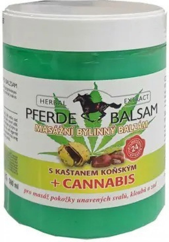 Pferde Balsam kaštan koňský gel s cannabis je masážní gel obsahující 23 léčivých bylin (jako např. Jírovec maďal, borovice lesní, jalovec obecný, řepík lékařský a td.)