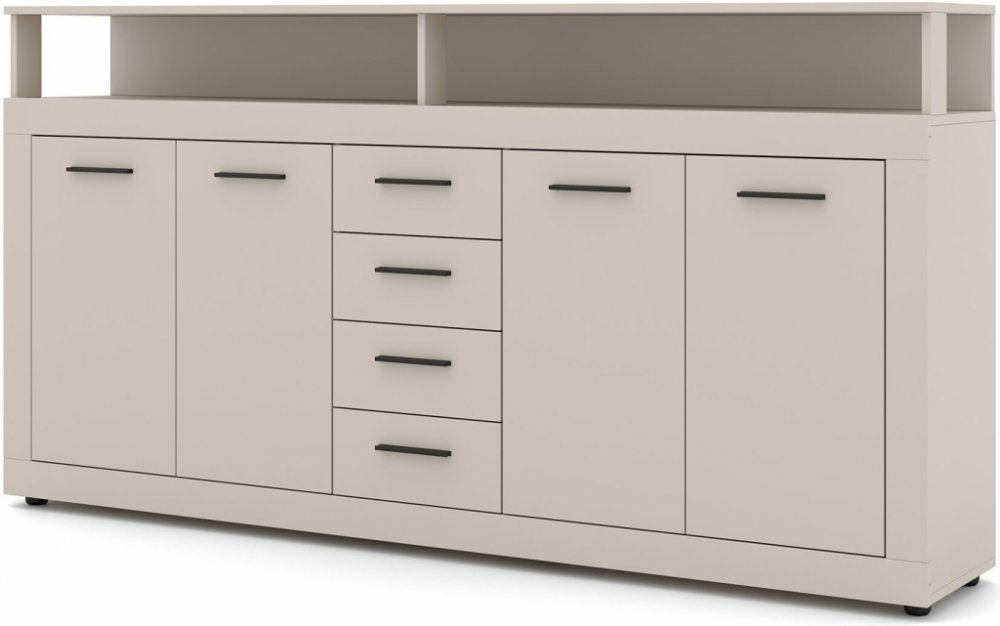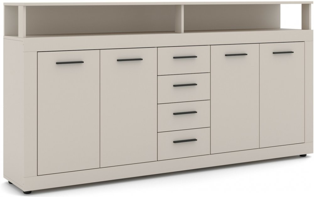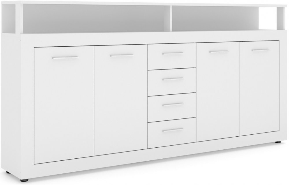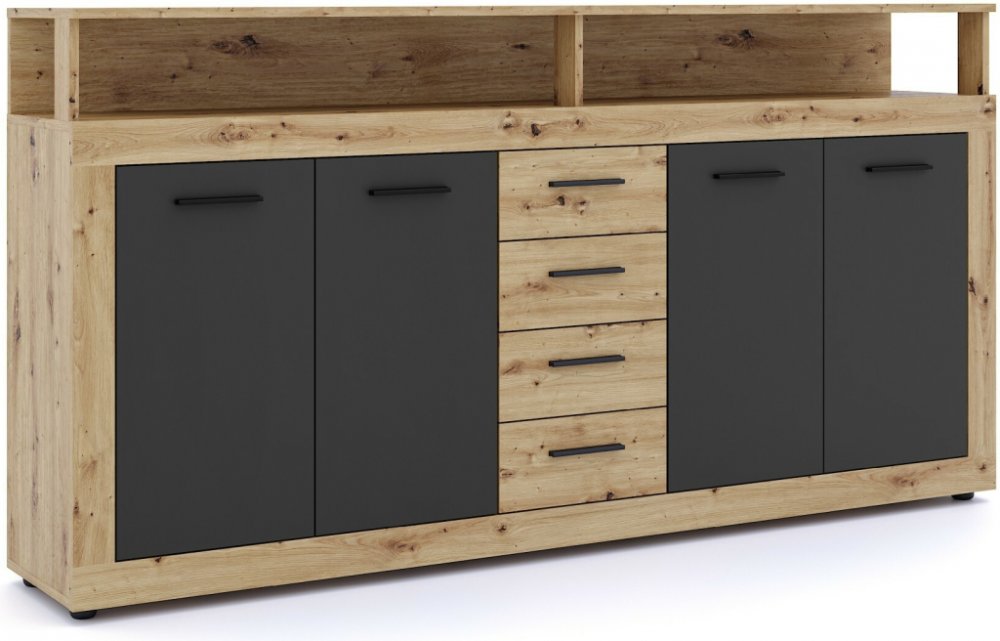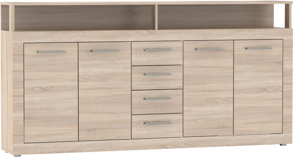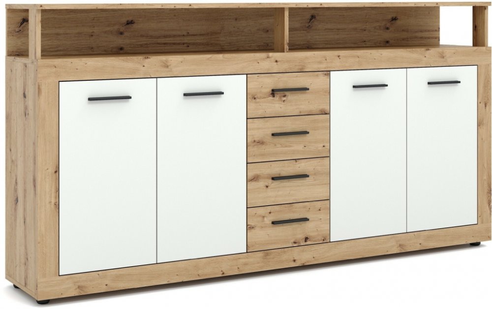 Funkčnost komody je promyšlená do posledního detailu. Čtyři zásuvky se hladce vysouvají a nabízí praktický prostor například pro dokumenty, oblečení či drobnosti. Čtvery dvířka ukrývají členěný úložný prostor s policemi, kam snadno uložíte i objemnější věci. Vrchní plocha přes celou šířku komody poslouží jako dekorativní plocha pro květiny, lampy nebo třeba rodinné fotografie.