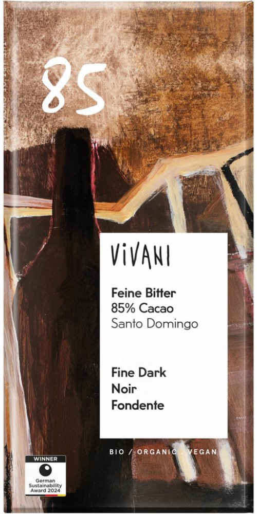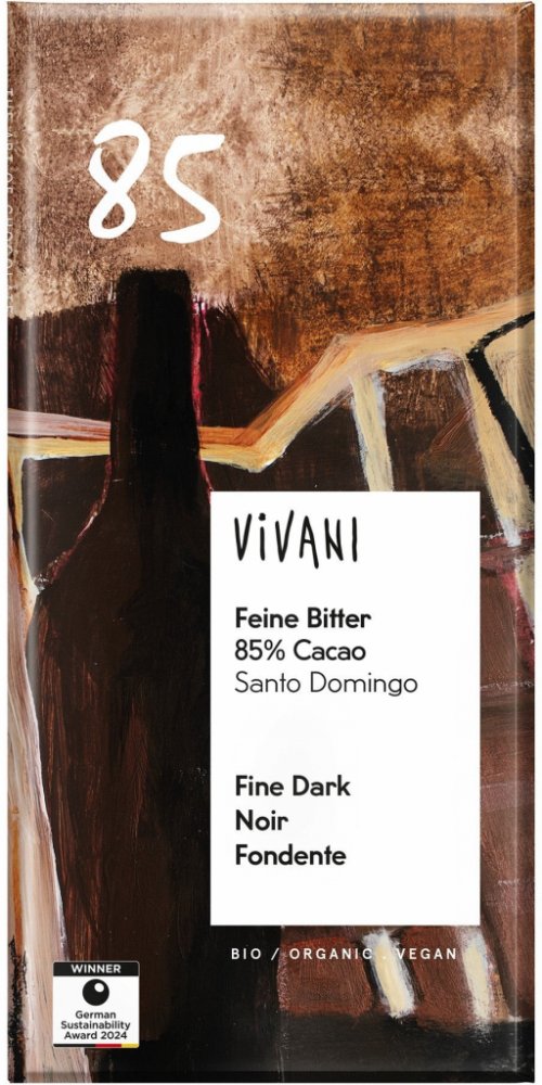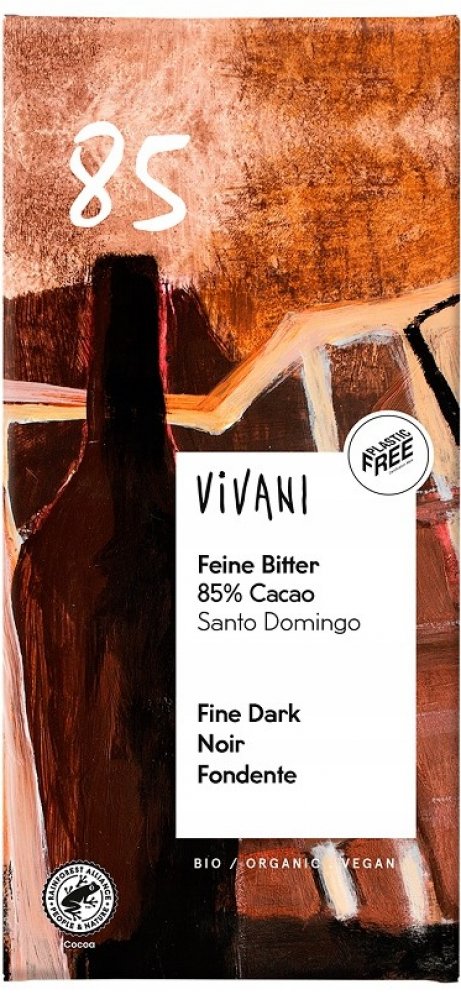 Vivani 100 g 85 % hořké Vivani Dominikánská republika klasické tabulkové karton 621.0 kcal na 100 g 53.3 g na 100 g 14.0 g na 100 g