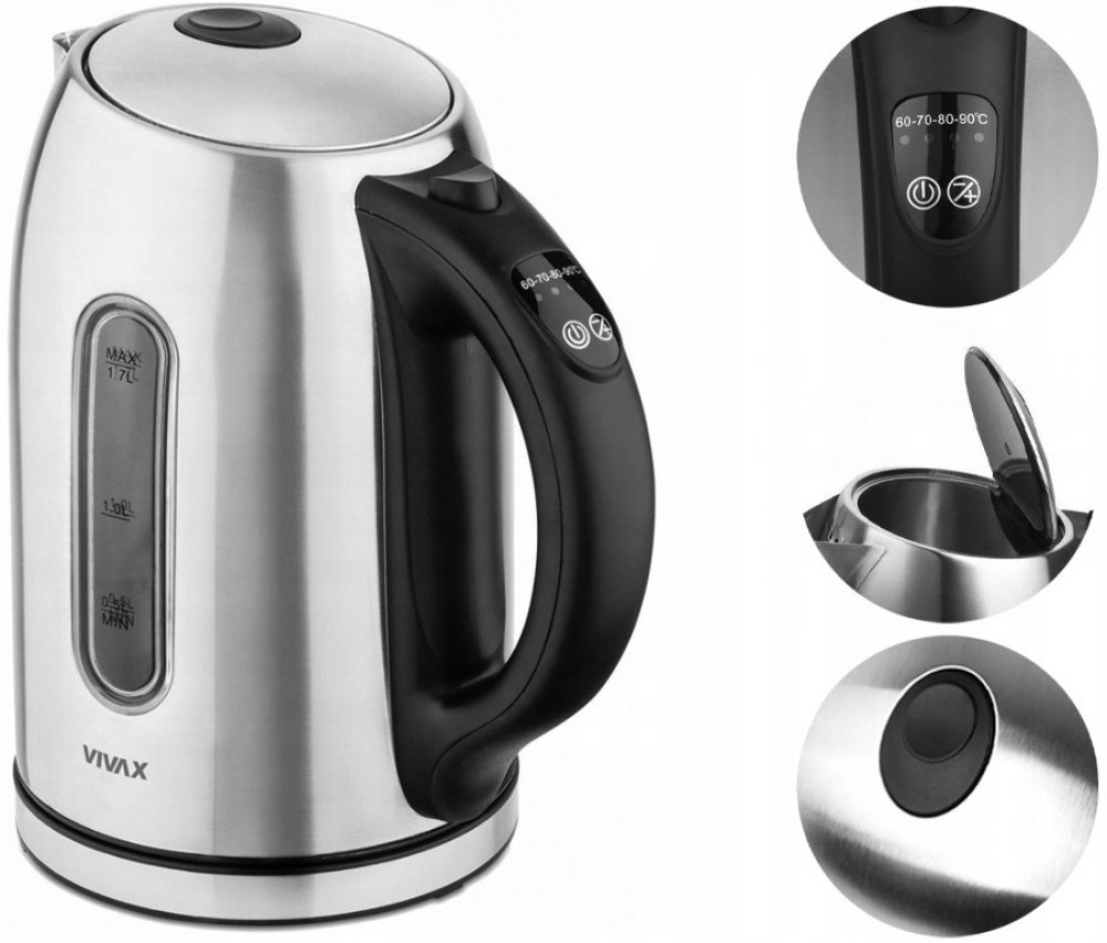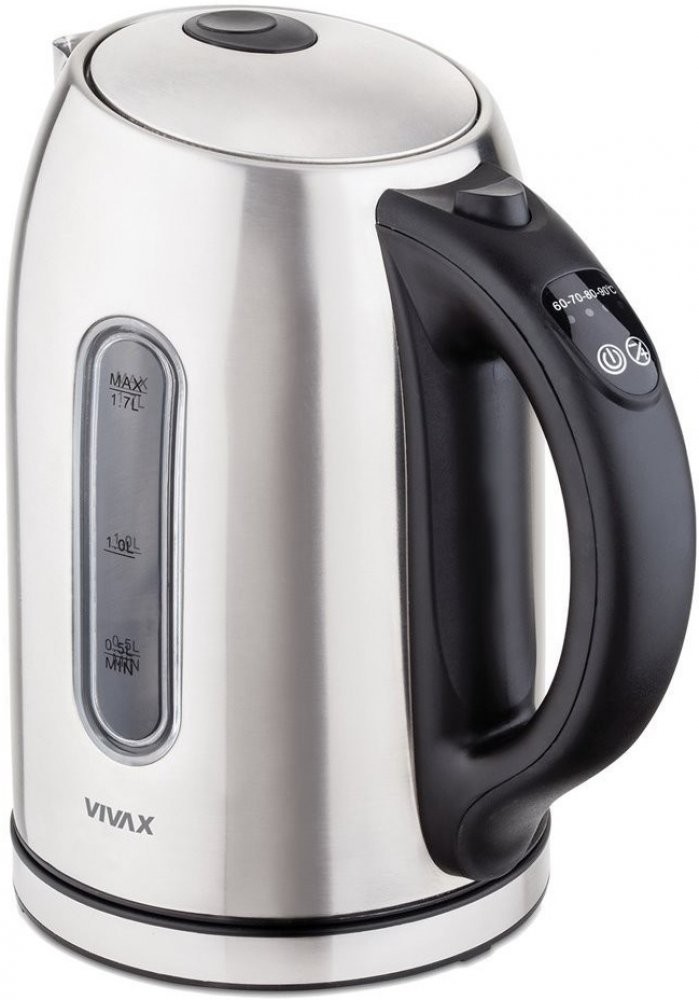 Zboží pochází z oficiální české distribuce. Výrobce: VivaxPart Number: WH-176TC VIVAX WH176TC Maximálně využitelný objem je 1,7 l a minimální ohřívané množství tekutiny 0,3 l 5 stupňů, mezi kterými si vždy vyberete nejvhodnější v danou chvíli - 60°C, 70°C, 80°C, 90°C nebo 100°C Automatické vypnutí při dosažení bodu varu Jemná síťka uvnitř konvice zachycující vodní kámen a jiné nečistoty LED diody zbarvené podle aktulně nastaveného stupně ohřevu Celkový výkon konvice je 2200 W Elegentní, moderní a jednoduchý design skvěle zapadající do všech interiérů Barva: nerez Rychlovarná konvice Vivax WH-176TC, nerez, 1,7l Rychlovarná konvice Vivax WH-176TC se rychle stane nepostradatelnou součástí vaší domácnosti. Na první pohled vás zaujme svým jednoduchým a elegantním designem vyhotoveným v nerezové barvě, která skvěle zapadne do všech interiérů. Konvice nabízí celkový objem 1,7 l a minimálně se v ní dá přivést k varu 0,3 l vody. Plně vybavená Během chvilky připraví teplou vodu k použití. Nedílnou součástí je vestavěný ukazatel množství vody, světelný indikátor a samozřejmostí je také automatické vypnutí při dosáhnutí bodu varu. Uvnitř konvice se nachází jemná síťka, která představuje ochranu před nechtěným vniknutím vodního kamene nebo jiných nečistot do vašeho nápoje. Podle vašich potřeb Konvice nabízí možnost navolit si teplotu dle vlastních preferencí, k výběru jsou varianty 60°C, 70°C, 80°C, 90°C nebo 100°C. Podle zvoleného stupně ohřívání se barva stupnice změní. Rychlovarná nerezová konvice s přehlednou stupnicí množství vody a objemem až 1,7 l se po dosažení požadované teploty automaticky vypne.