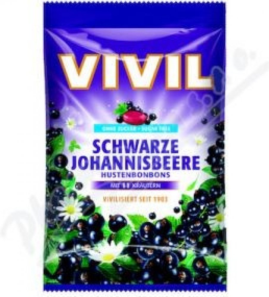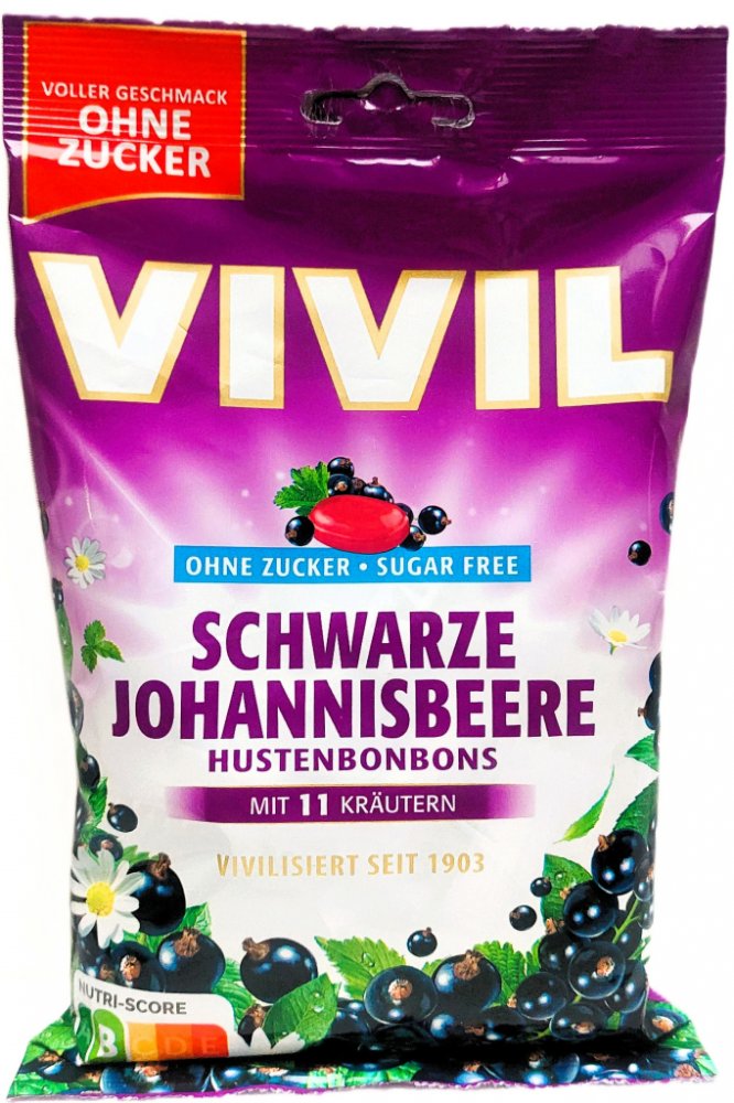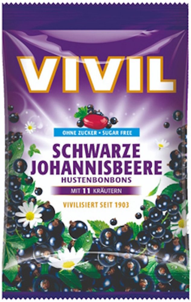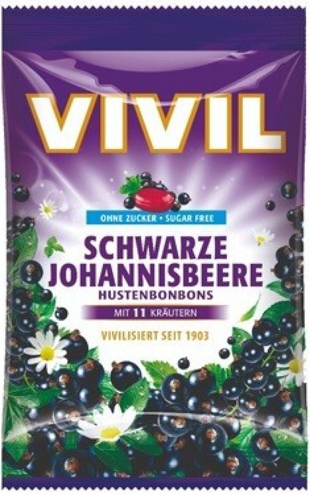 Vivil Černý rybíz + 11 bylin jsou bonbony s příchutí černého rybízu a 11 druhů bylin. Bez cukru, s náhradními sladidly.