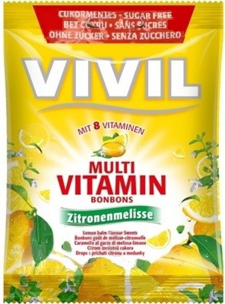 Vivil Multivitamin tvrdé neplněné bonbony bez cukru se sladidly s osvěžující příchutí citronu a meduňky. Vivil bonbóny jsou obohaceny osmi vitamíny.