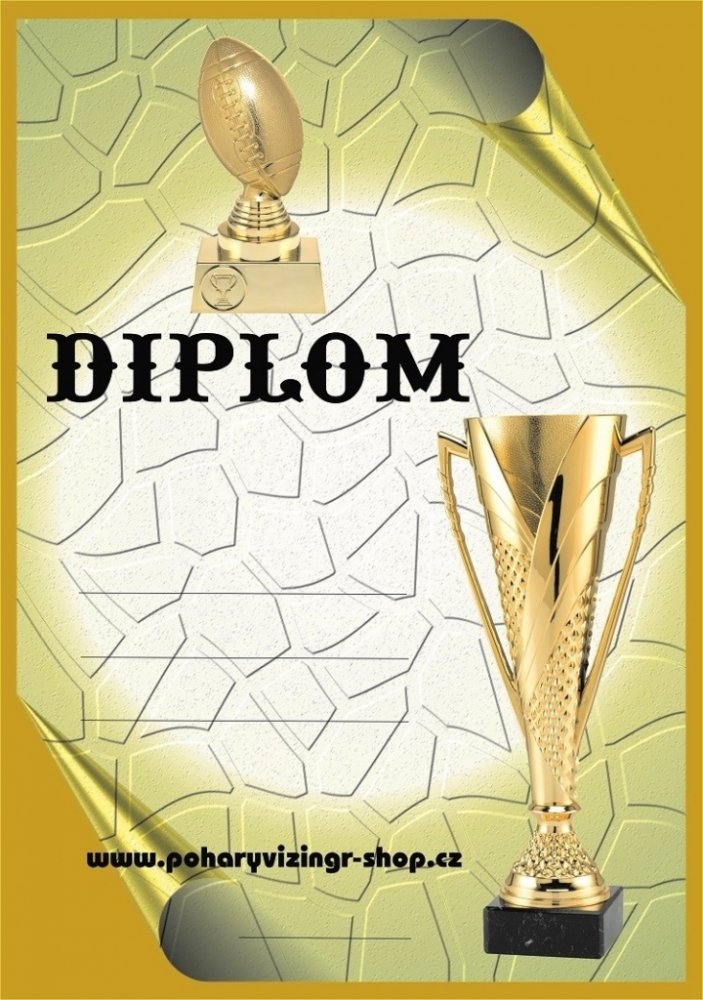 Amer.fotbal č.2. Diplom formátu A4 (250 g). Objednáváte NEVYPLNĚNÉ DIPLOMY(BEZ TEXTU) a chcete si je vyplňovat vlastní tiskárnou - napište do textu "BEZ LINEK". Objednáváte diplomy VYPLNĚNÉ - krátké a stejné texty napište zde. Požadujete-li dlouhé nebo různorodé texty napište je prosím ve svém PC a vložte soubor (např.PDF,Corel,WORD,Exel apod.) před uzavřením objednávky jako přílohu. Do diplomu lze vložit i Vaše logo, foto apod. - pro realizaci je vhodné konzultovat e-mailem v jakém formátu požadované logo máte k dispozici.Vyplněné diplomy(četná uznání, pamětní listy apod.) Vám i zalaminujeme - vhodné domluvit na prodejně. -