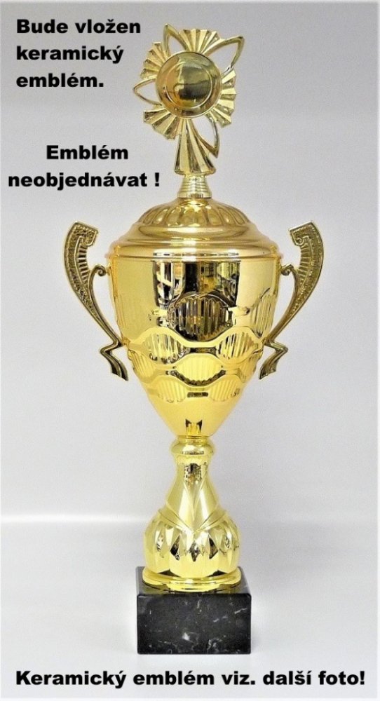 K27-FG030. Masivní pohár o hmotnosti 4,4 kg. Velikost poháru je uvedena za lomítkem katalogového čísla. Průměr kalichu je 20 cm. Do poháru je vložen keramický emblém o průměru 7 cm. Text na štítek napište jen do rubriky "štítek na" např. PUTOVNÍ POHÁR PRIMÁTORA a do součtu štítků zadejte 1 !!! Pokud objednáváte ve větším počtu a pro různé kategorie, zpracujte texty ve Vašem PC a přiložte jako samostatný soubor k tomu určený před uzavřením objednávky (2 krok pokladna) a zde vyplňte pouze počty štítků - pro správnou kalkulaci. Ukázka možného zpracování štítku viz.další foto. -