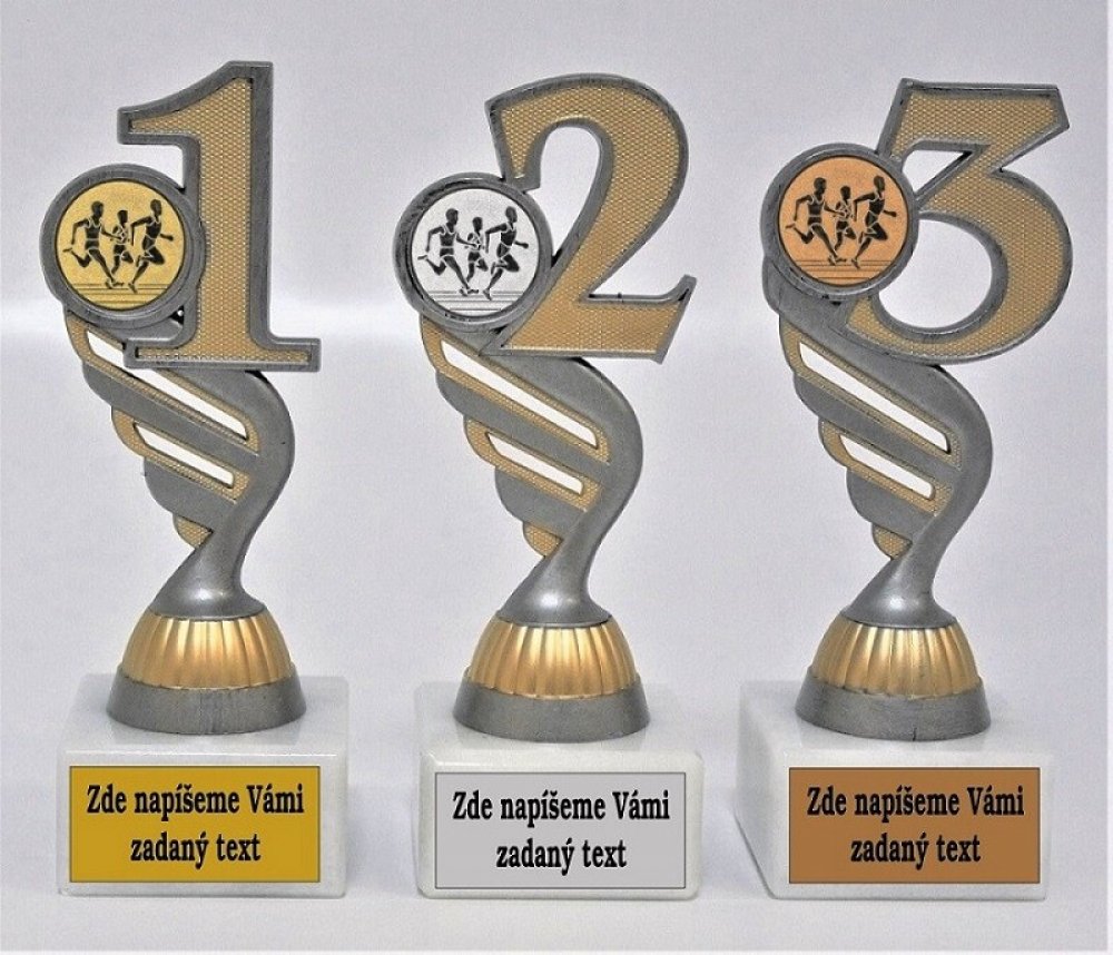 P401-3.22-830-27. Velikost trofejí s pořadím je 16 cm. Objednáváte celou sadu 1.-3. místo, text na štítek napište do rubriky "štítek na" a do košíku zadejte 3. Pokud objednáváte ve větším počtu a pro různé kategorie, zpracujte texty ve Vašem PC a přiložte jako samostatný soubor k tomu určený před uzavřením objednávky a zde vyplňte pouze součet štítků - pro správnou kalkulaci/fakturaci/. -