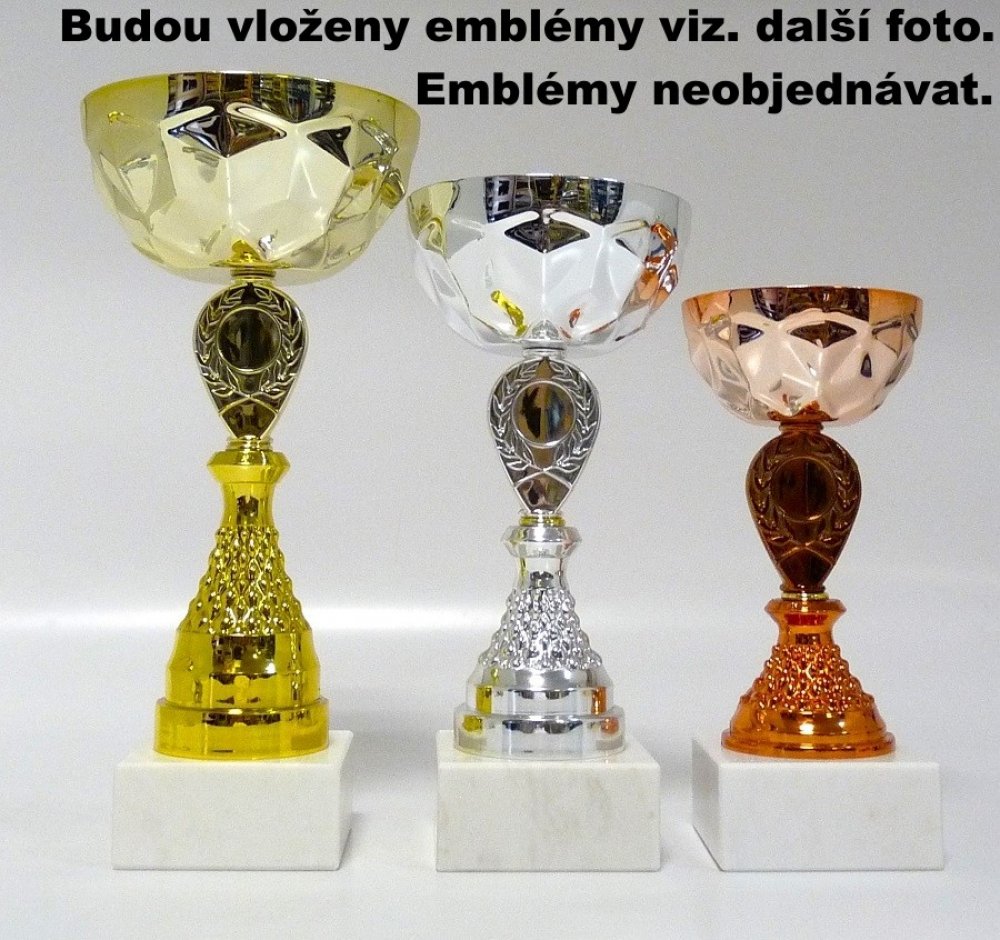 510-K034. Průměr kalichů 14,12,10 cm. Emblém již v ceně. Velikost poháru je uvedena za lomítkem katalogového čísla. Při nákupu celé sady (510/30-zlato-26-stříbro-22-bronz) text na štítky napište jen do rubriky ,,štítek na" a do součtu štítků zadejte 3 !!! Ukázka možného zpracování štítku viz. další foto. Objednáváte-li více pohárů a pro různé kategorie, zpracujte Váš požadavek na štítky ve svém PC...