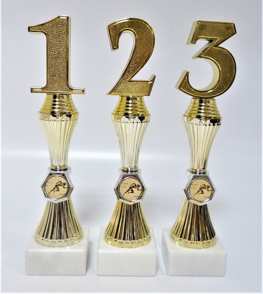 71-26. Velikost trofejí s pořadím je 28 cm včetně mramorového podstavce. Při nákupu jedné sady trofejí (1-2-3) - text na štítek napište jen do rubriky "štítek na" např. MISTROVSTVÍ ČR dorostenci Plzeň 5.6.2020 a do součtu štítků zadejte 3 !!! Ukázka možného zpracování štítku viz. další foto. Pokud objednáváte ve větším počtu a pro různé kategorie, zpracujte texty ve Vašem PC a přiložte jako samost...