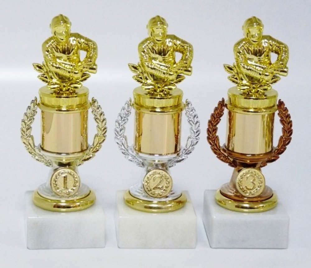 33-P033. Trofeje s pořadím viz.další foto. Velikost trofejí 19 cm. Objednáváte celou sadu trofejí 1-2-3.místo, text na štítek napište jen do rubriky "štítek na" a do košíku zadejte 3. Ukázka zpracování štítku viz.další foto. Pokud objednáváte ve větším počtu a pro různé kategorie, zpracujte texty ve Vašem PC a přiložte jako samostatný soubor k tomu určený před uzavřením objednávky (2 krok pokladna...