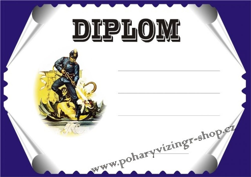 Hasič č.22. Diplom formátu A4 (250 g). Objednáváte NEVYPLNĚNÉ DIPLOMY (BEZ TEXTU) a chcete si je vyplňovat vlastní tiskárnou - napište do textu "BEZ LINEK". Objednáváte diplomy VYPLNĚNÉ - krátké a stejné texty napište zde. Požadujete-li dlouhé nebo různorodé texty napište je prosím ve svém PC a vložte soubor (např.PDF,Corel,WORD,Exel apod.) před uzavřením objednávky jako přílohu. Do diplomu lze vl...