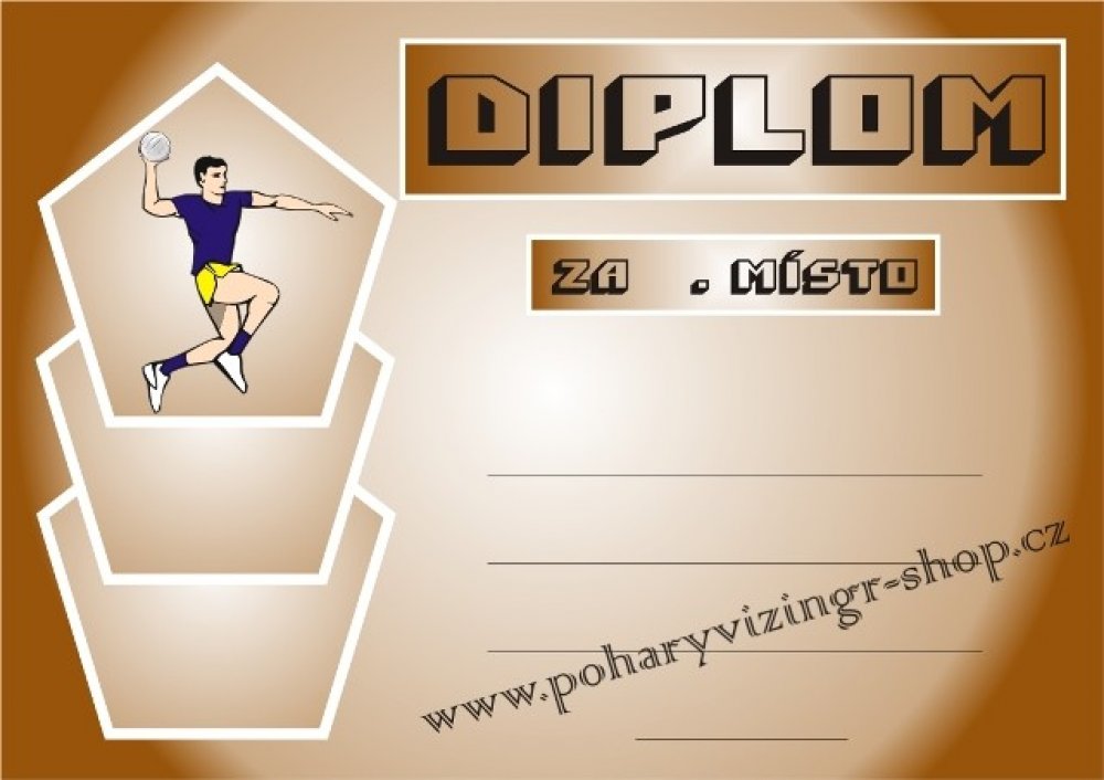 Házená č.4. Diplom formátu A4 (250 g). Objednáváte NEVYPLNĚNÉ DIPLOMY (BEZ TEXTU) a chcete si je vyplňovat vlastní tiskárnou - napište do textu "BEZ LINEK". Objednáváte diplomy VYPLNĚNÉ - krátké a stejné texty napište zde. Požadujete-li dlouhé nebo různorodé texty napište je prosím ve svém PC a vložte soubor (např.PDF,Corel,WORD,Exel apod.) před uzavřením objednávky jako přílohu (2 krok pokladna). Do diplomu lze vložit i Vaše logo, foto apod. - pro realizaci je vhodné konzultovat e-mailem v jakém formátu požadované logo máte k dispozici.Vyplněné diplomy(četná uznání, pamětní listy apod.) Vám i zalaminujeme - vhodné domluvit na prodejně. -