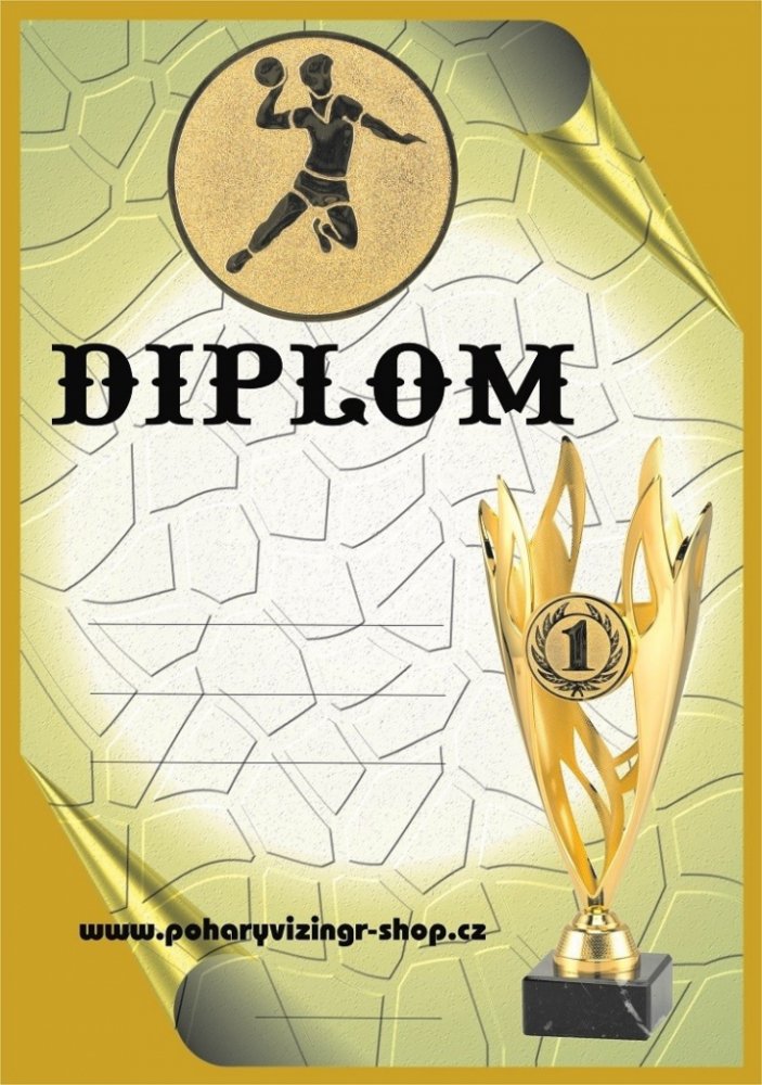 Házená č.12. Diplom formátu A4 (250 g). Objednáváte NEVYPLNĚNÉ DIPLOMY (BEZ TEXTU) a chcete si je vyplňovat vlastní tiskárnou - napište do textu "BEZ LINEK". Objednáváte diplomy VYPLNĚNÉ - krátké a stejné texty napište zde. Požadujete-li dlouhé nebo různorodé texty napište je prosím ve svém PC a vložte soubor (např.PDF,Corel,WORD,Exel apod.) před uzavřením objednávky jako přílohu (2 krok pokladna). Do diplomu lze vložit i Vaše logo, foto apod. - pro realizaci je vhodné konzultovat e-mailem v jakém formátu požadované logo máte k dispozici.Vyplněné diplomy(četná uznání, pamětní listy apod.) Vám i zalaminujeme - vhodné domluvit na prodejně. -